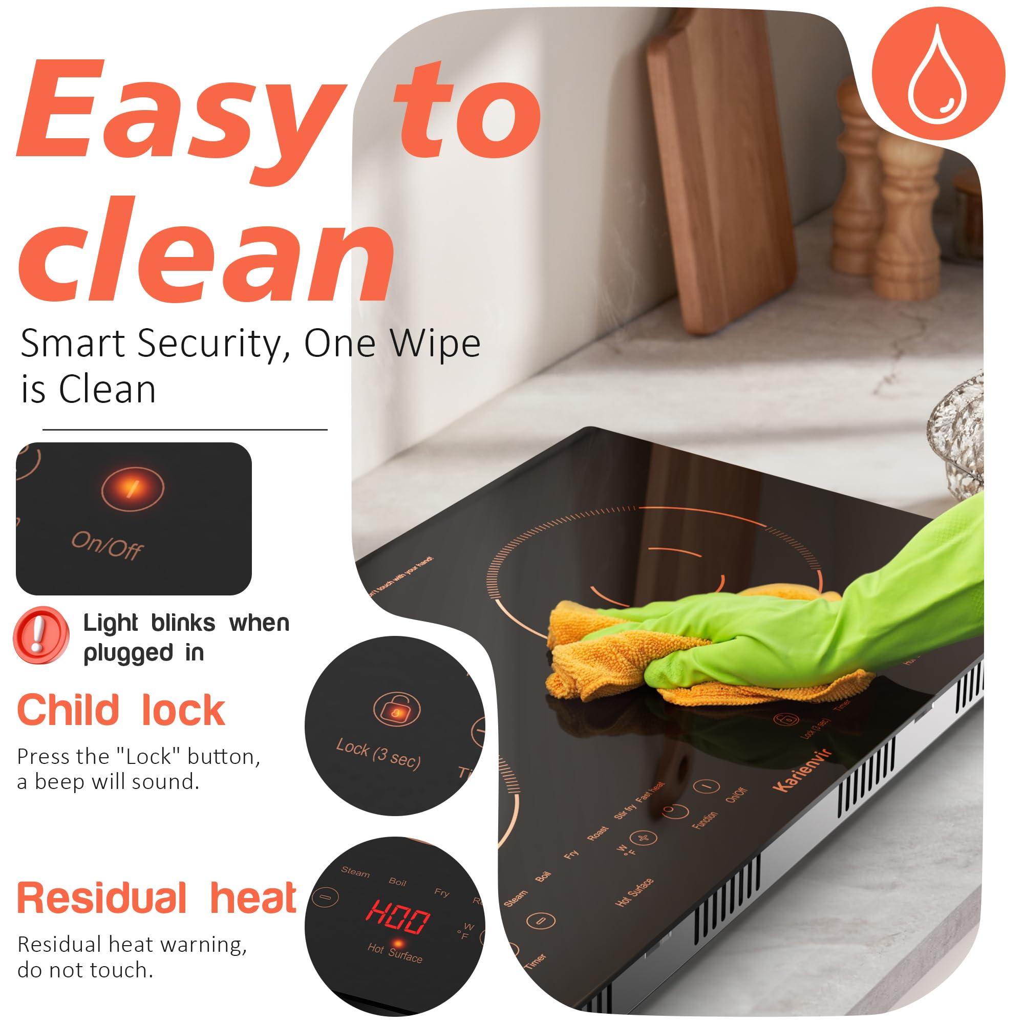 Safety Lock, Timer Double Protection : Karienvir portable electric cooktop 2 burners with built-in timer of up to 240 minutes. Precisely control the cooking time to avoid overcooking or burning food. Slow cooking food is easy to manage, no need to wait for long time in front of the electric stove. The electric cooktop comes with a safety lock design that locks all keys except the on/off button, which is a valuable feature for families with small children or pets, avoiding accidental touches and ensuring that the whole process is used.