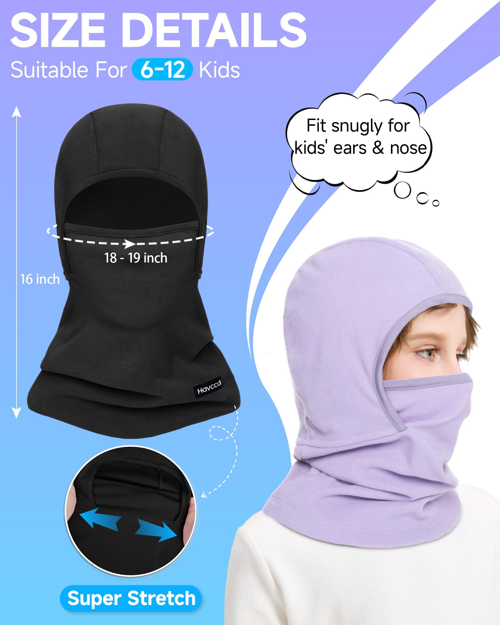 HIGH ELASTICITY & FITS MOST: The winter face mask for kids is stretchy on all sides, allowing it to adapt to most face shapes and head sizes. Suitable for boys and girls aged from 6 to 12 without being too tight or losing its shape, providing both warmth and flexibility for all outdoor activities. Additionally, this kids balaclava is machine-washable and durable.