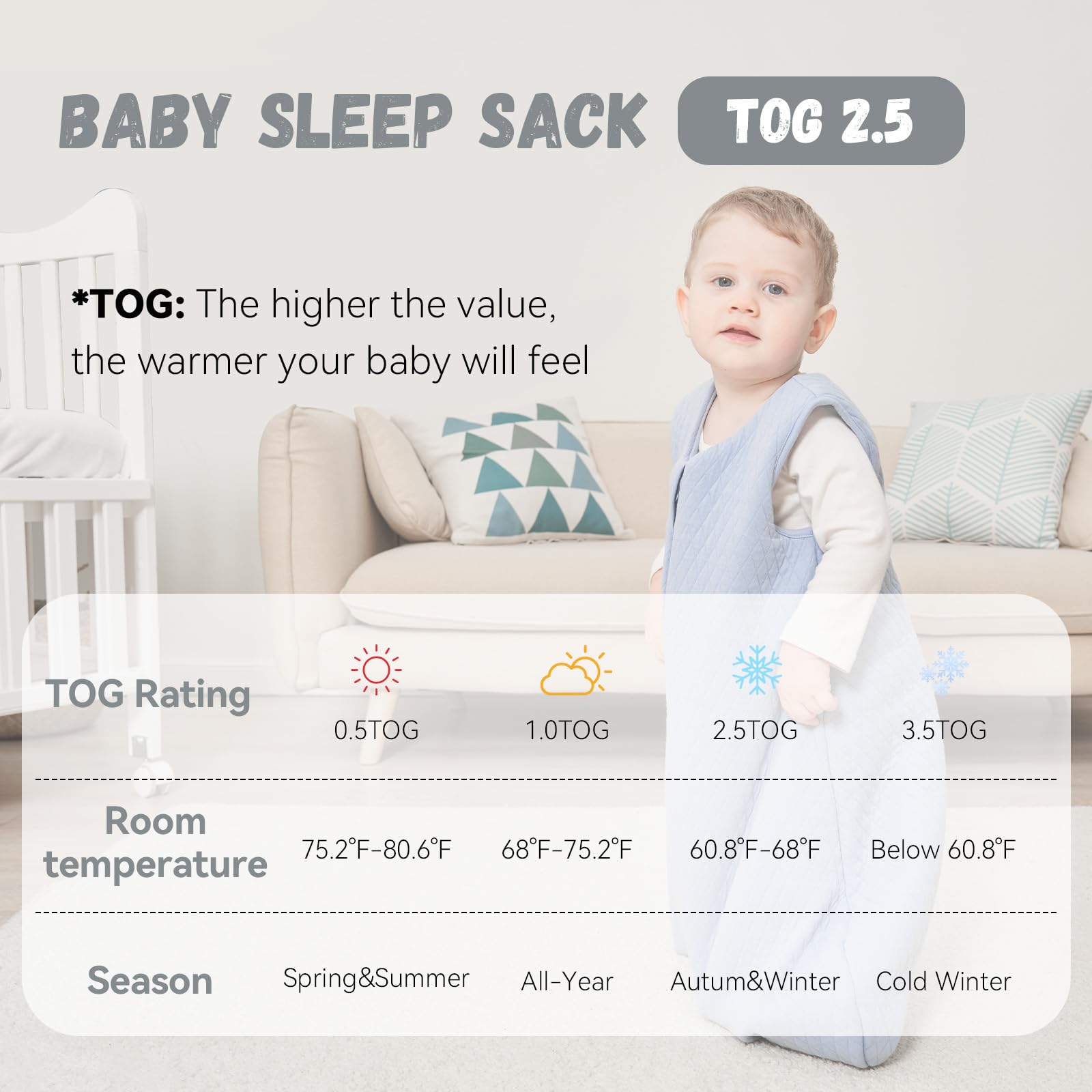 Warm and Cozy - This baby sleep sack made with 100% Organic cotton fabric and fluffy polyester filling, super-soft and breathable for comfort. TOG 2.5 sleep sack is ideal for cooler weather. 3-layer breathable material and sleeveless design helps regulate baby's temperature, reducing overheating risk and ensuring warmth and cozy.
