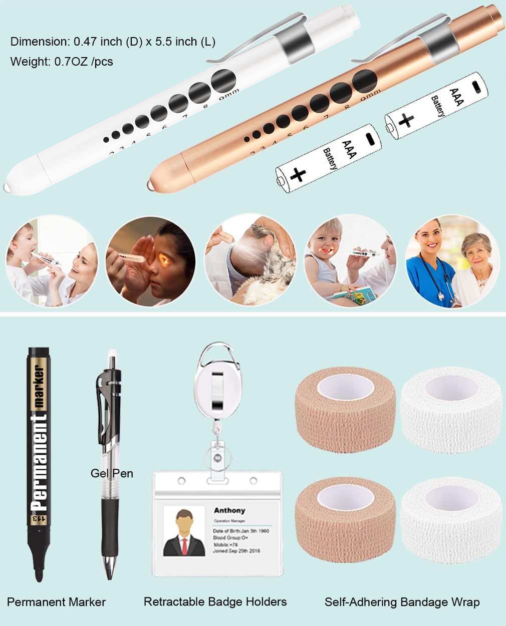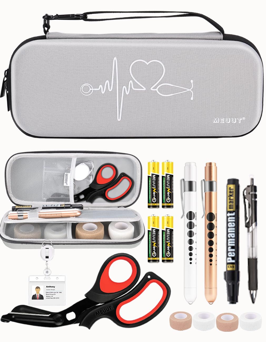 【STETHOSCOPE CASE KIT】: Come with a stethoscope case kit, contained 1 pcs stethoscope case, 1 pcs pantented medical scissor, 2 pcs pen lights for nurses, 4 pcs self adhesive bandage wraps, 1 pcs permanent marker, 1 pcs ballpoint Pen, 1 pcs Medical Scissor, 1 pcs retractable badge holder set with Carabiner Reel Clip.