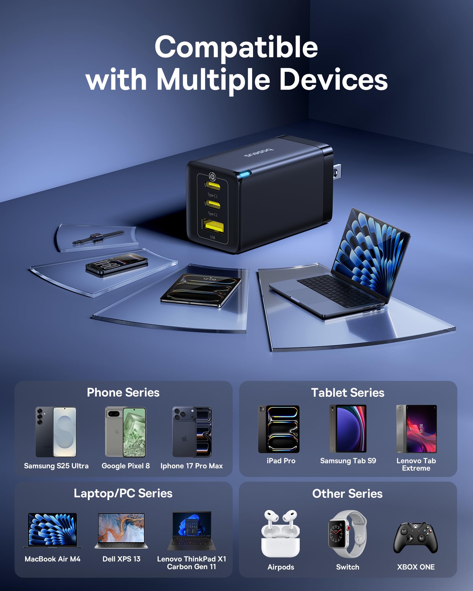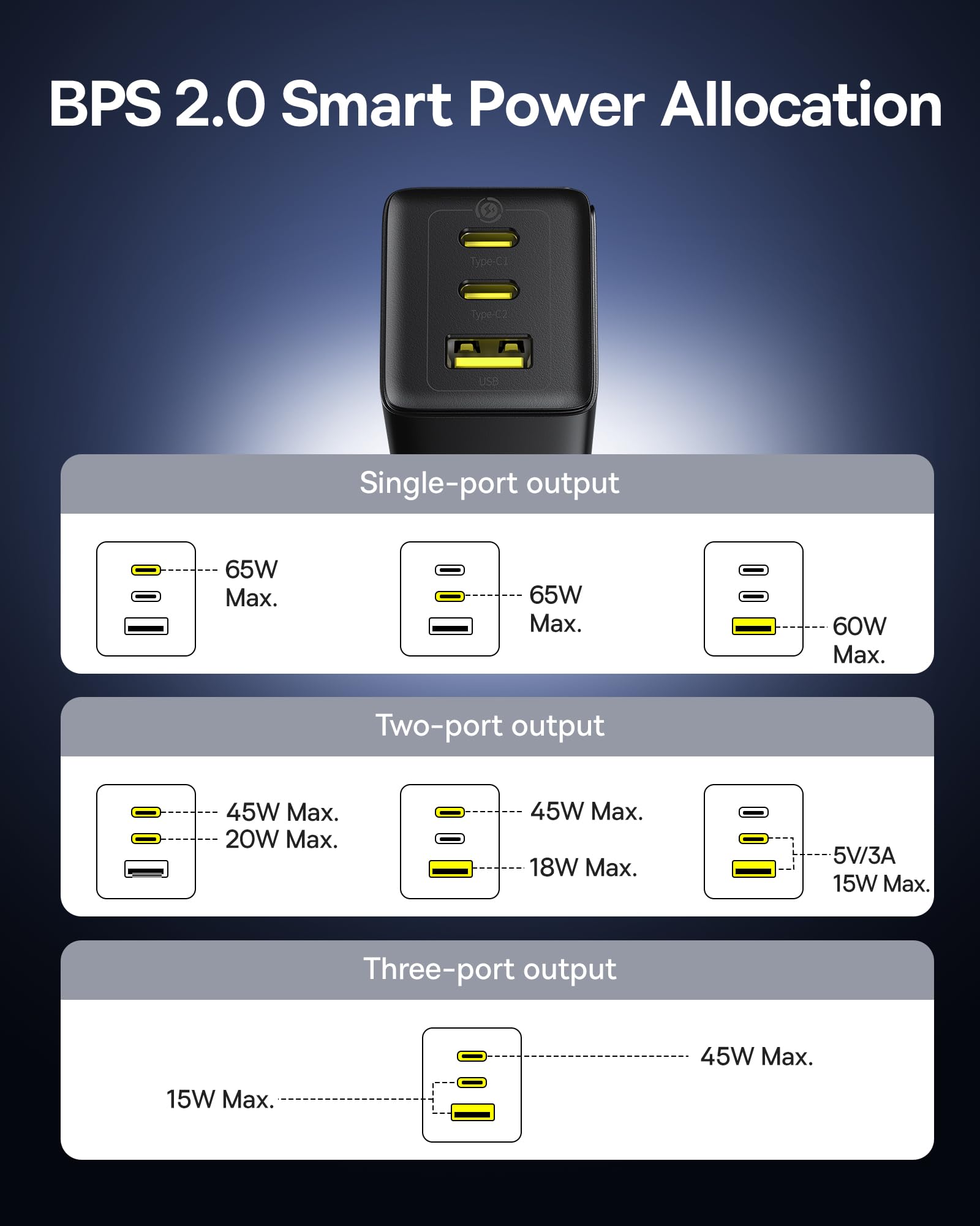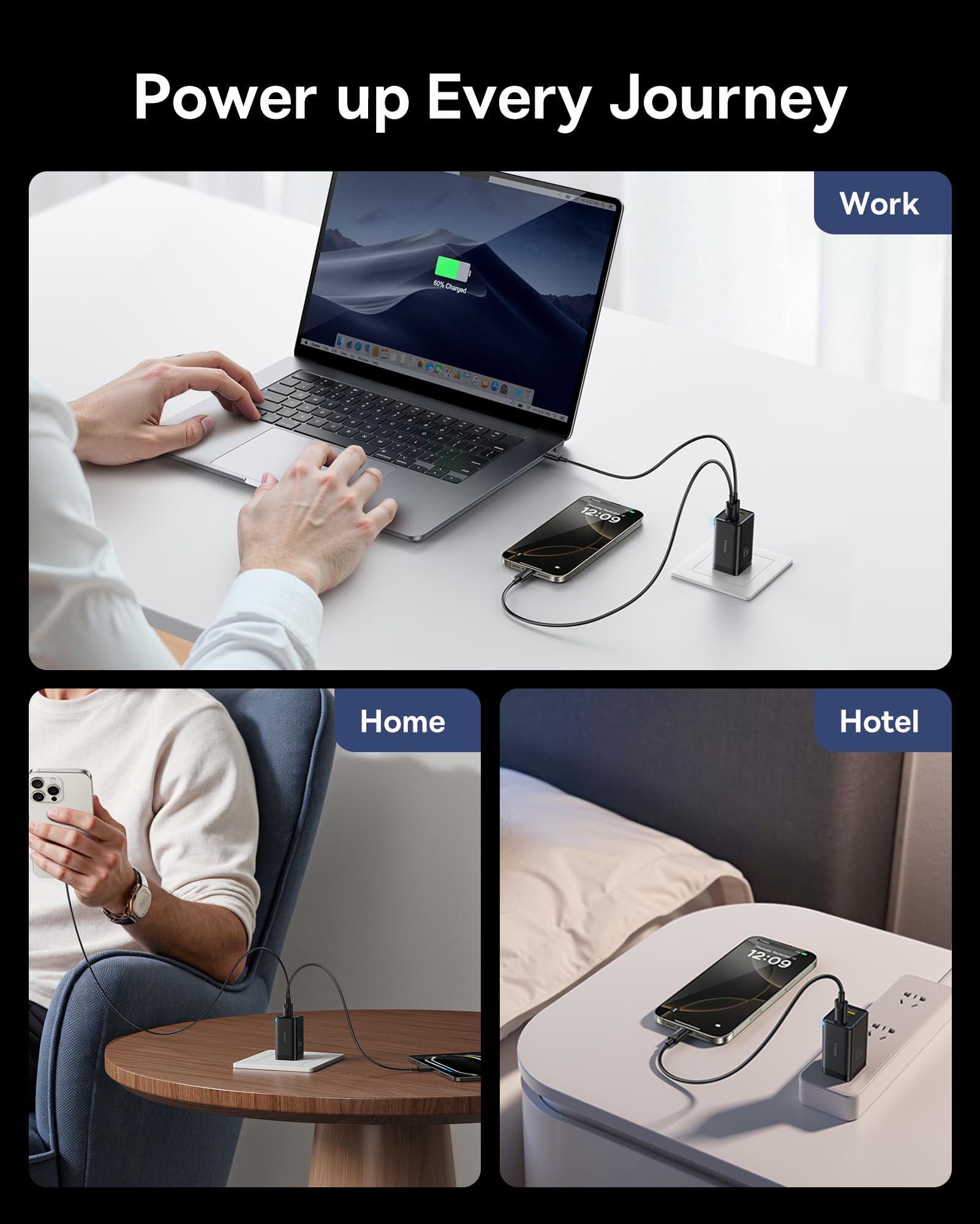 Fast Charging for 3 Devices: Connect a single device for a powerful 65W max charge – enough to fast-charge a MacBook Air at full speed. Effortlessly charge up to three devices simultaneously (USB-C + USB-C + USB-A). Intelligent technology dynamically allocates the optimal wattage (up to 65W total) to each connected device for safe, efficient charging every time.