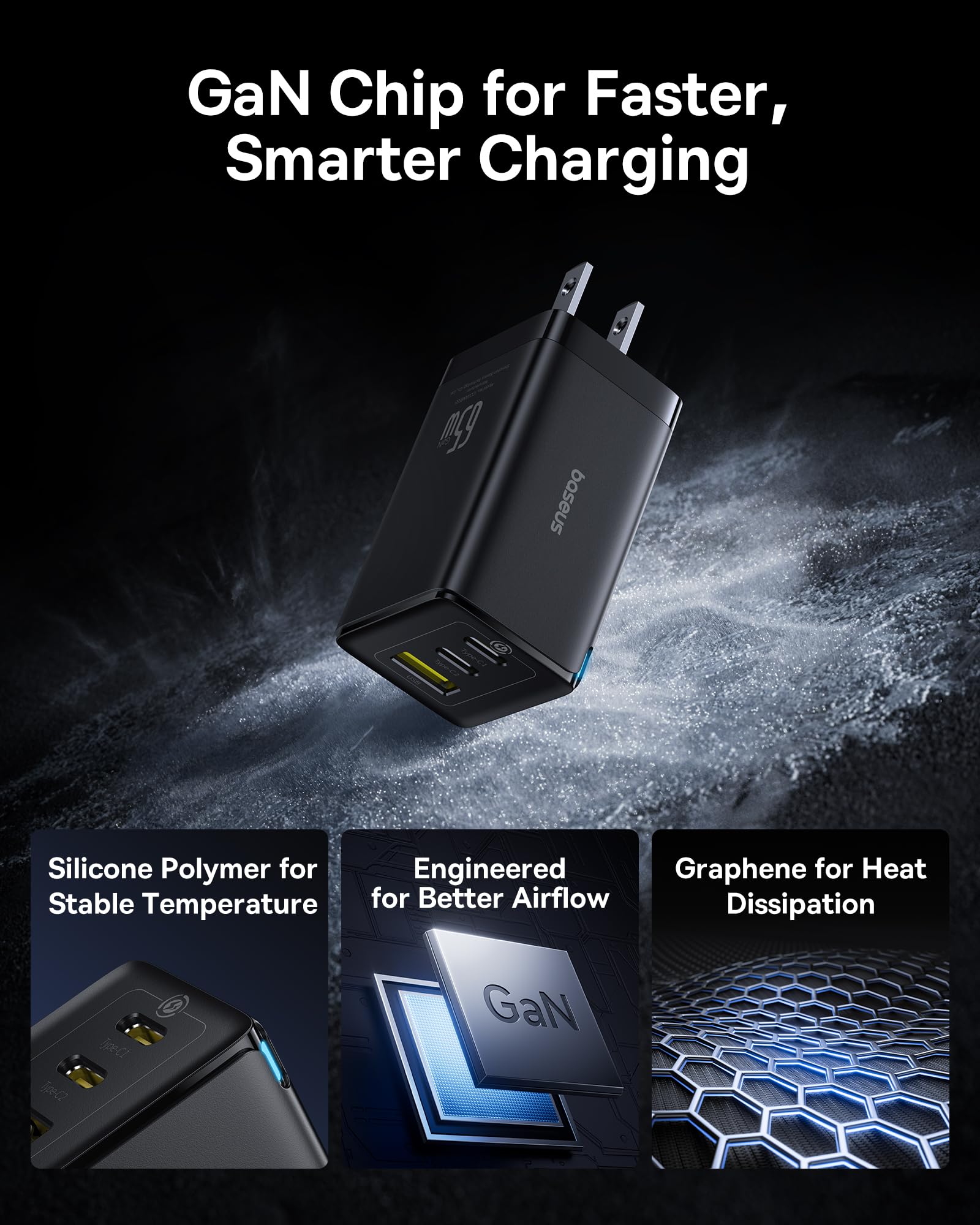 Powered by GaN Tech: Powered by GaN chip technology, this 65W USB-C charger boasts an impressive 92% energy conversion rate to redefine your ultimate safe, fast charging experience with higher efficiency, lower temperature, and smaller size.