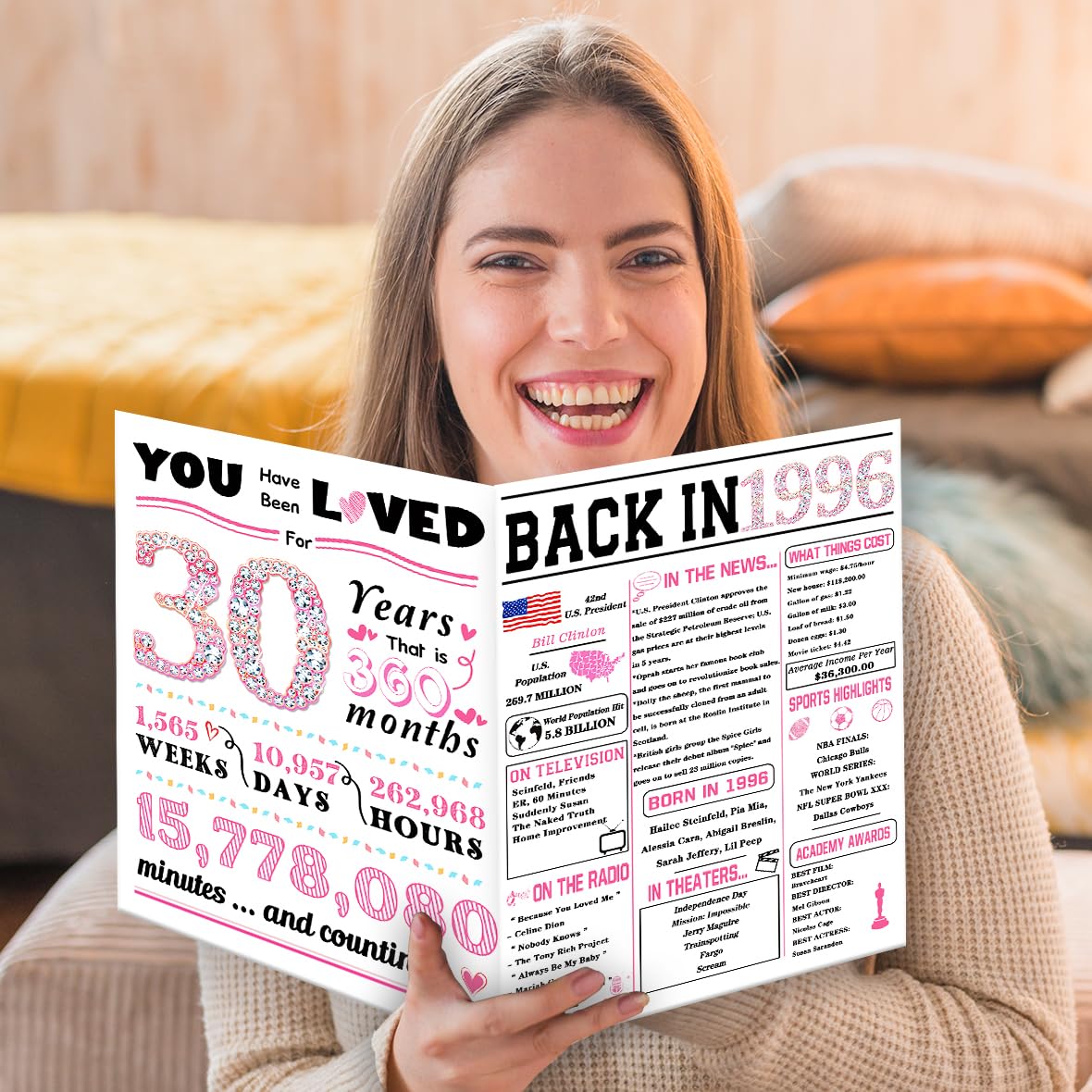 30th Birthday Cards This card uniquely marks the exact years, months, and days your loved one has been loved, filled with the top songs, movies, sports, news, and celebrities from that special year, for a nostalgic walk down memory lane.