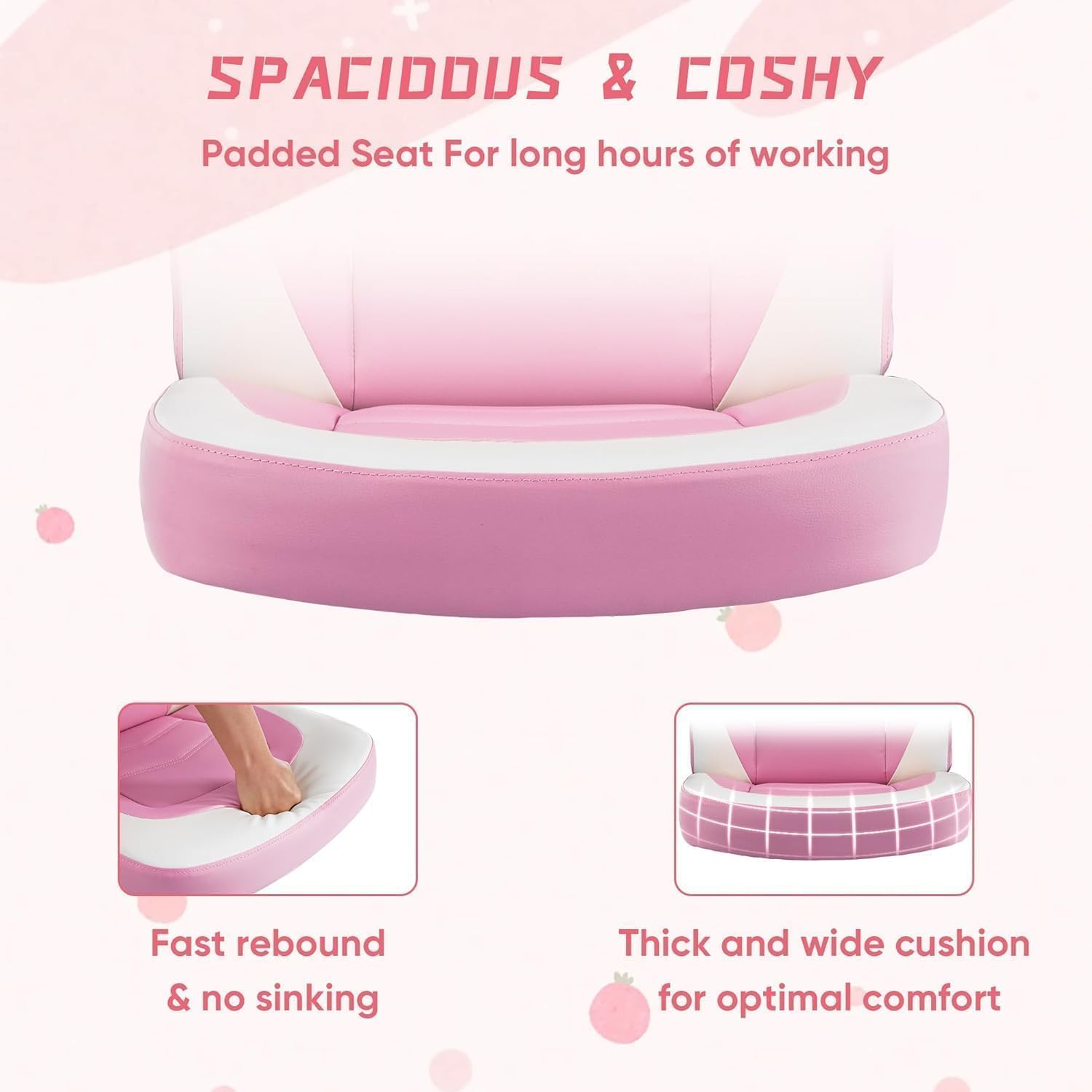 Ergonomic design and upholstered seat - This gaming desk chair is made of PU leather for comfort and breathability. The seat cushion is designed to be thick and slightly concave to conform to the curve of the hips. In addition, multi-line elements and a cut-out backrest protrusion can also help you find the most relaxed sitting position that is best suited for long gaming or work hours.