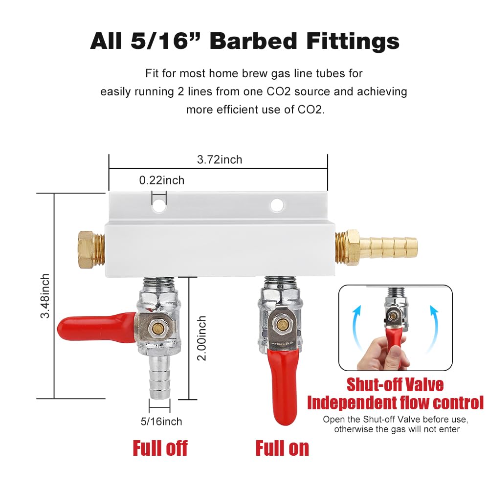 Efficient CO2 Utilization: Precisely controls CO2 flow. Ensure consistent carbonation pressure in each keg to achieve stable carbonation and ensure perfect taste. The two-way CO2 manifold effortlessly directs gas through 2 lines from one CO2 source, efficiently splitting the gas supply for optimal CO2 utilization. The inlet and Outlet feature 5/16" barbed fittings, ideal for most homebrew gas tubes