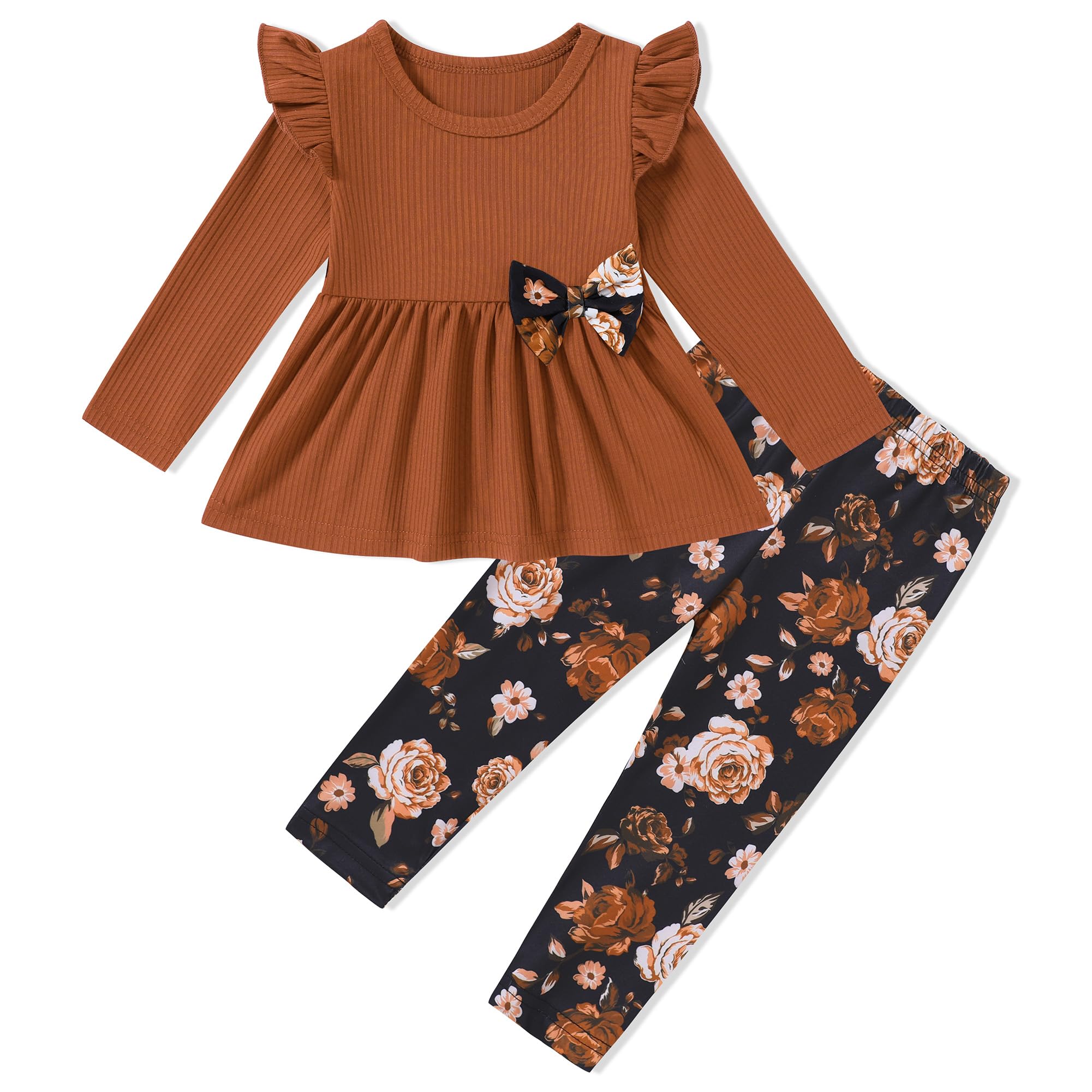 Design: The toddler girl outfit features a long-sleeve top, charming ruffled hem and delicate bow detail, paired with matching floral-print pants. This girls clothes set creates a cute, coordinated look that’s both trendy and timeless