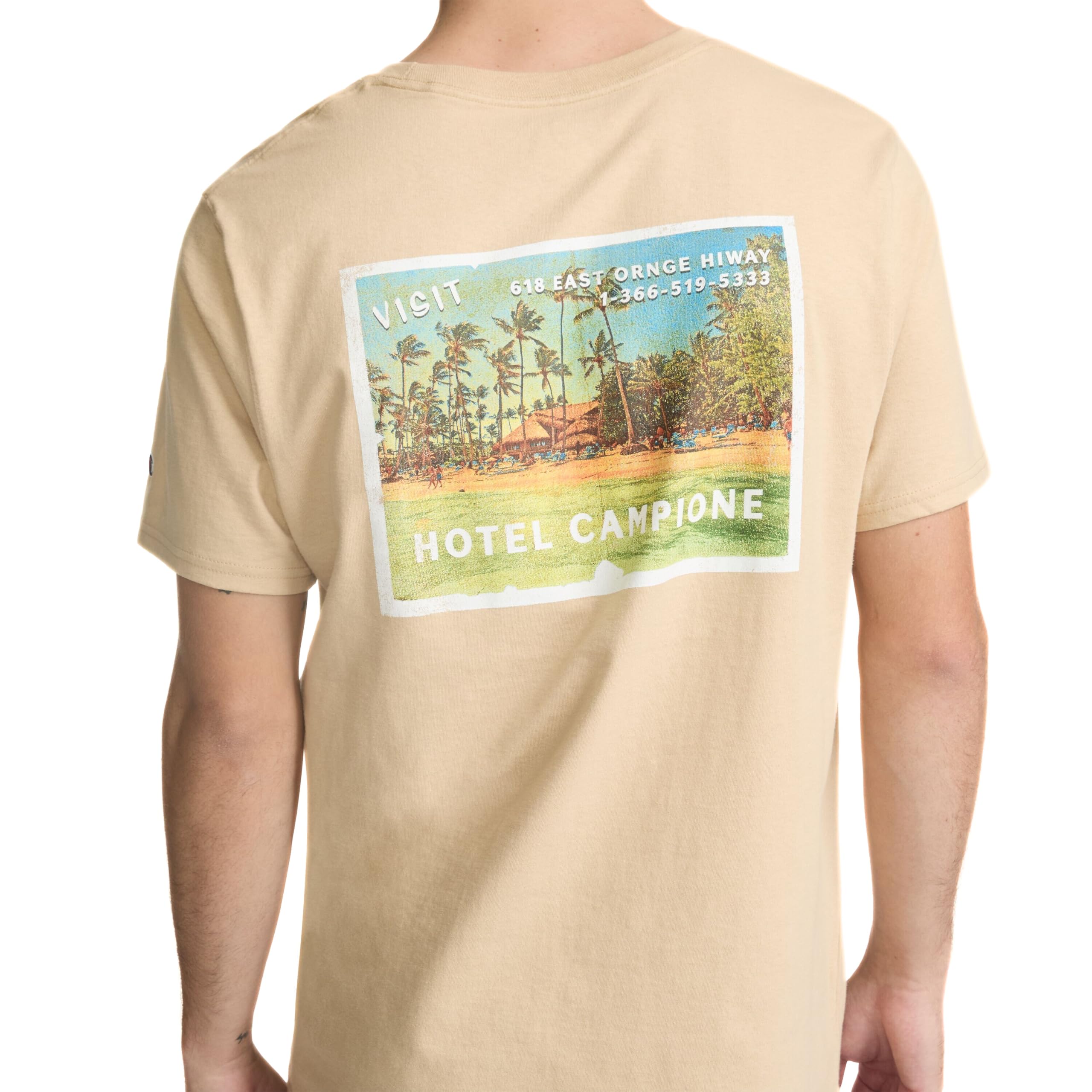 THE GRAPHIC - Front left chest Champion script with "Hotel Campione" photoreal postcard inspired graphic.