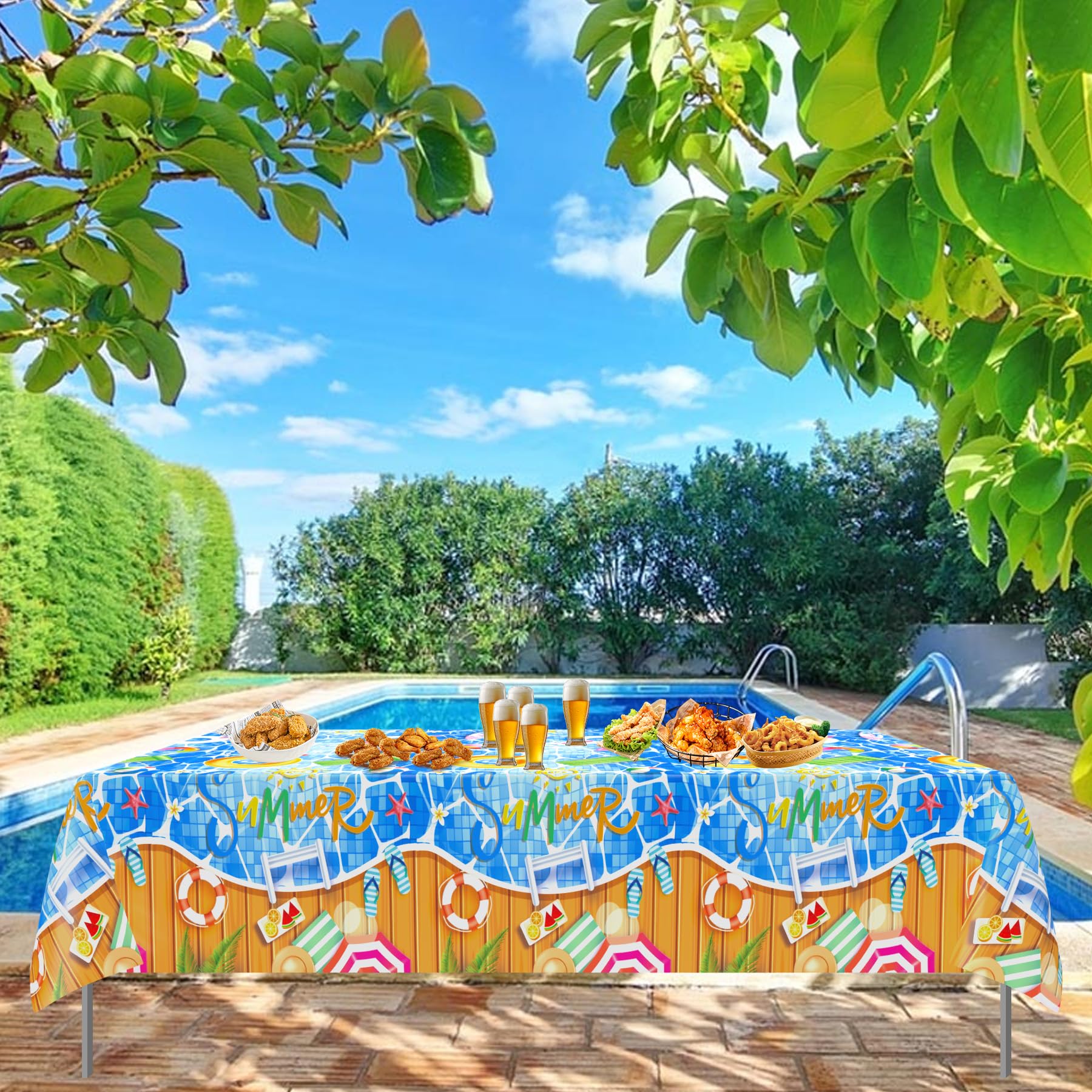 SUMMER THEME DESIGN: The summer tablecloths are designed with printed wooden boards, palm leaves, swimming rings, pools, lounge chairs and other patterns, and the main body is made of sea wave blue color. Bright and gorgeous, full of summer color and vitality, be in the middle of the pool beach and enjoy the summer sunny beach. Perfect choice for summer beach pool party decorations.