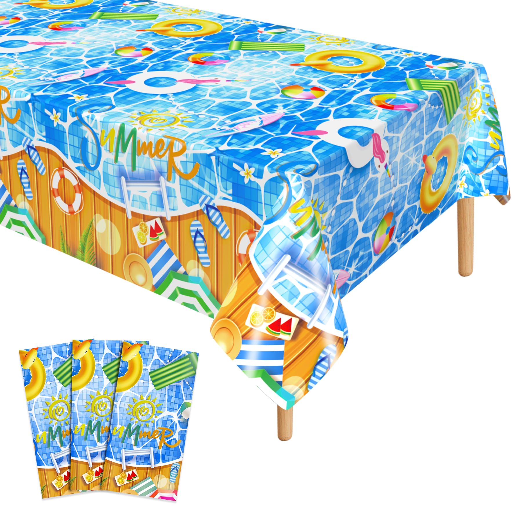 Features: EASY TO CLEAN UP: The summer pool party plastic tablecloths are single use. After the meal is over, the tablecloths can be easily packed and cleaned of garbage and stains, no need to wash, saving time. Bring you a relaxing party experience. Package Includes:3 x Pool Party Tablecloths Function: 1. Tabletop protection 2. Party decoration 3. Easy to clean up Size: 54 x 108 inches Material: Thickened PE material Remarks: 1. Please allow slight deviation in size. 2. Colors may vary slightly due to different screen displays.