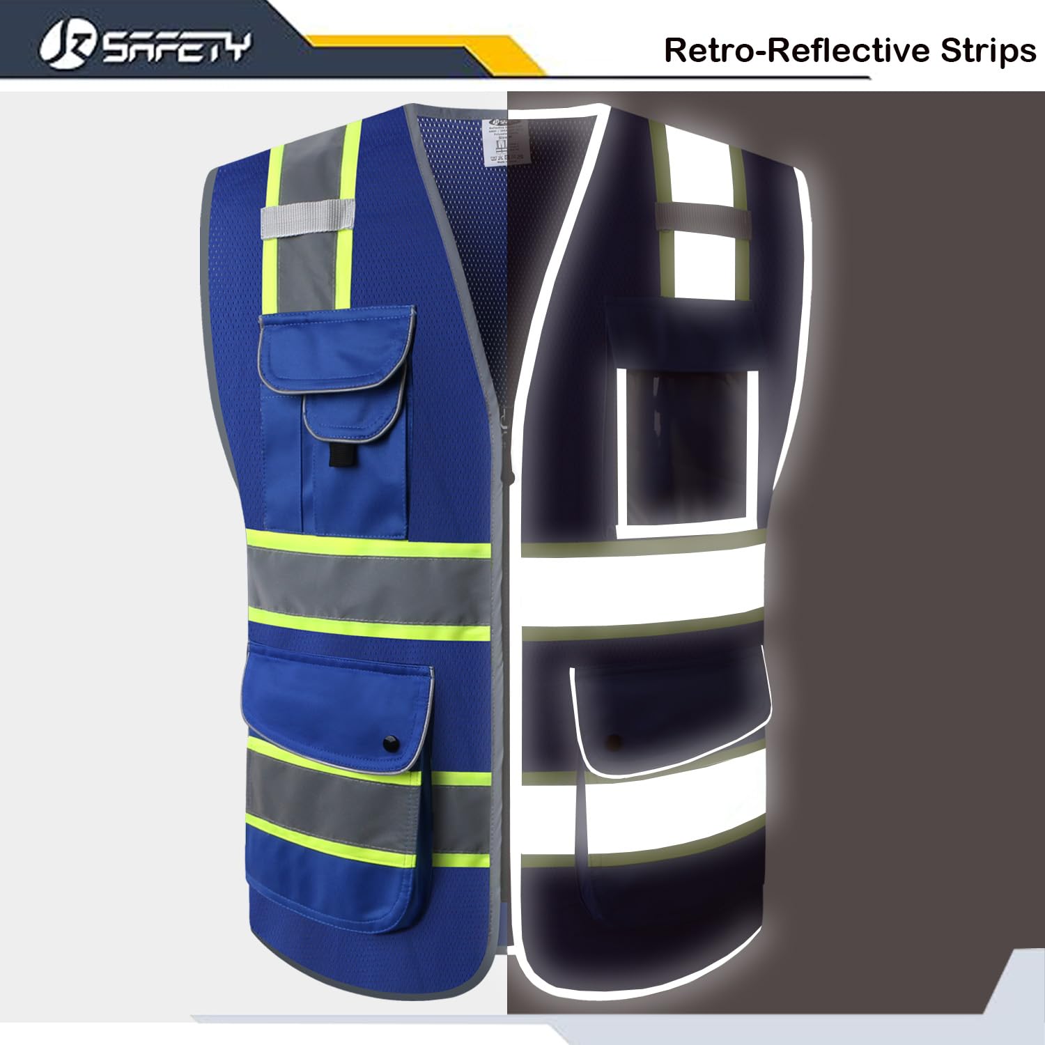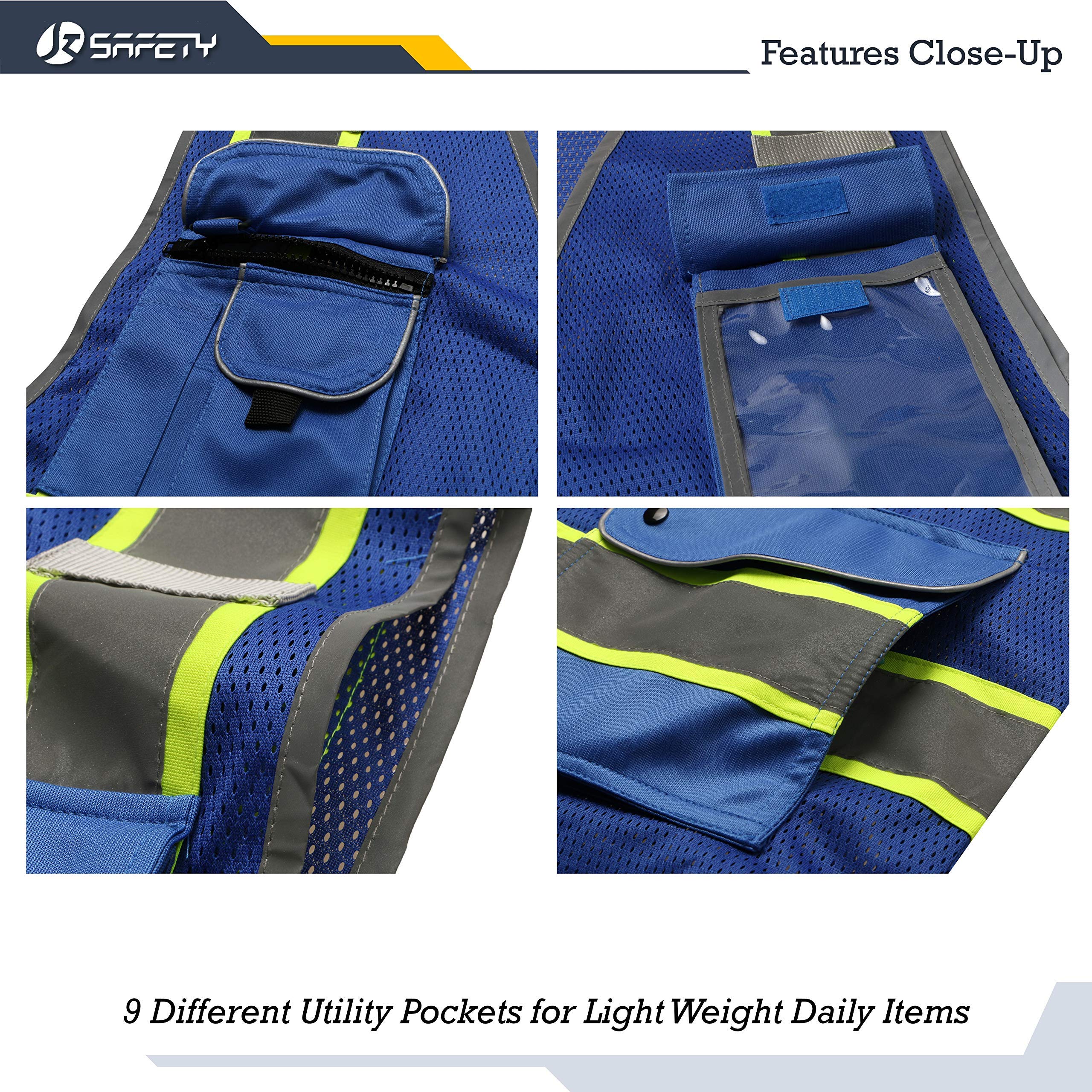 HIGH VISIBILITY AND 360¡ã REFLECTIVITY: Blue safety vest is highly visible with Four 2-inches wide Yellow color trims reflective strips covering the chest, the waist, and the back, she can reflect 360 degrees Retro-Reflective light wave under daylight or low light conditions.