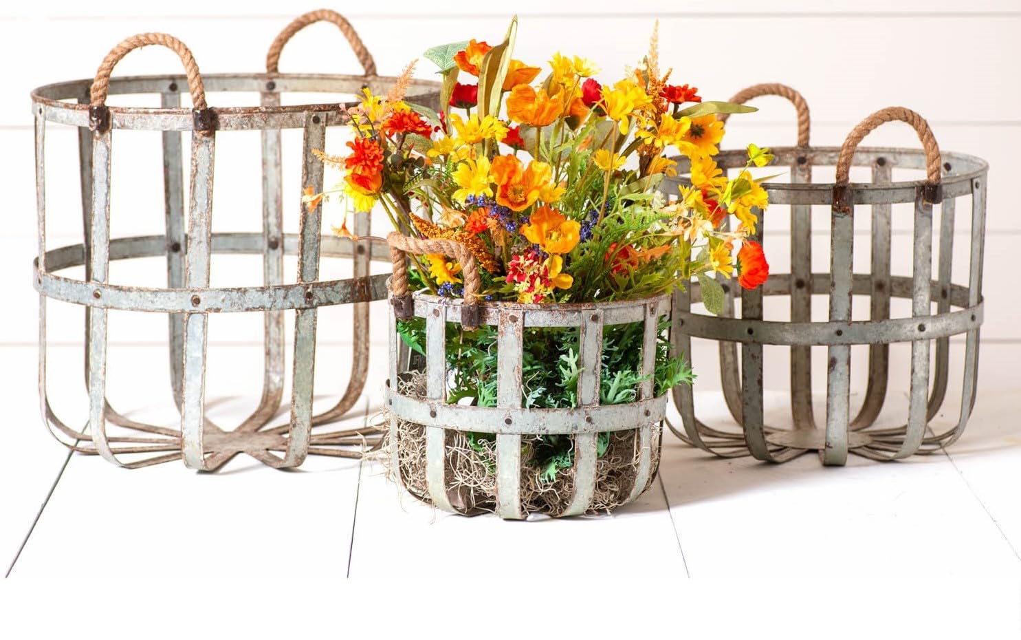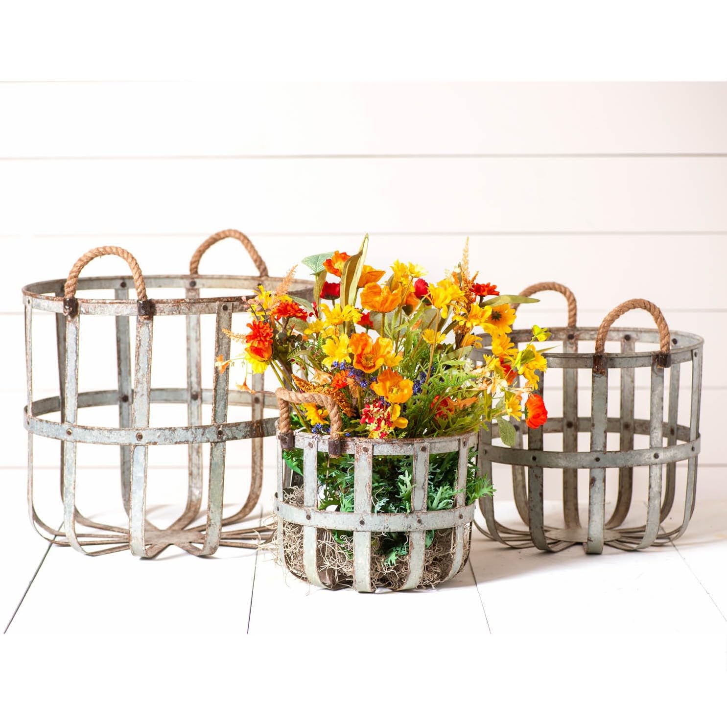 Each of the set's 3 baskets features full metal construction, real rope handles, and an airy, wide-slat design that mimics the silhouette of authentic orchard and apple baskets