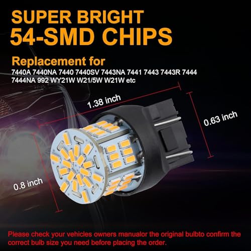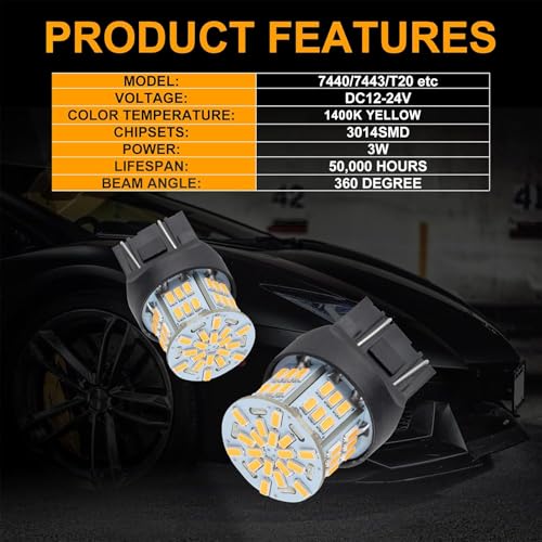 Key Specs: Voltage DC 12V-24V, 1400K Amber Yellow, Wattage 3w, low power consumption and fast heat dissipation for longer lifespan. The 7443 led light bulbs are compatible with 7440A 7440NA 7440 7440SV 7443NA 7441 7443 7443R 7444 7444NA 992 WY21W W21/5W W21W etc.