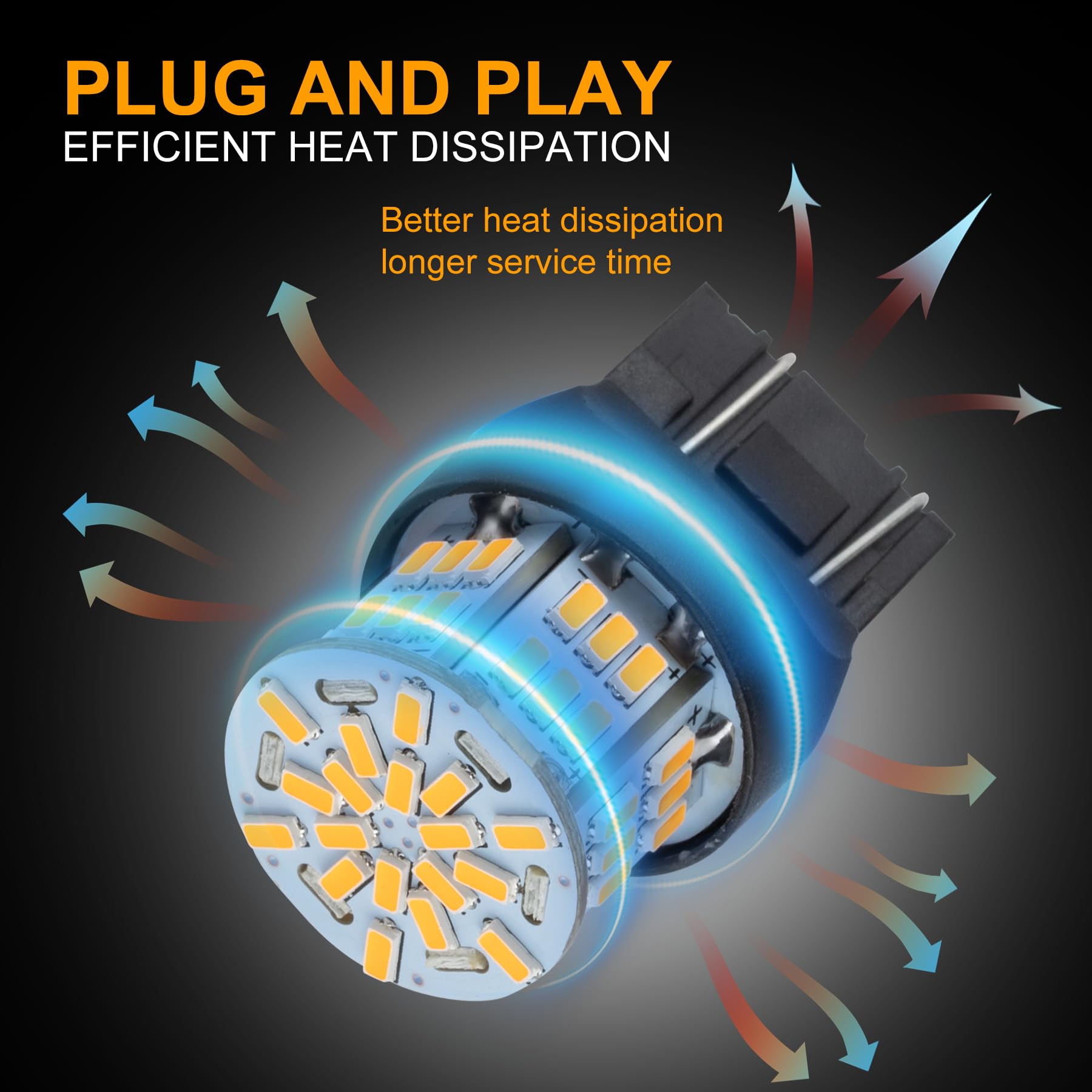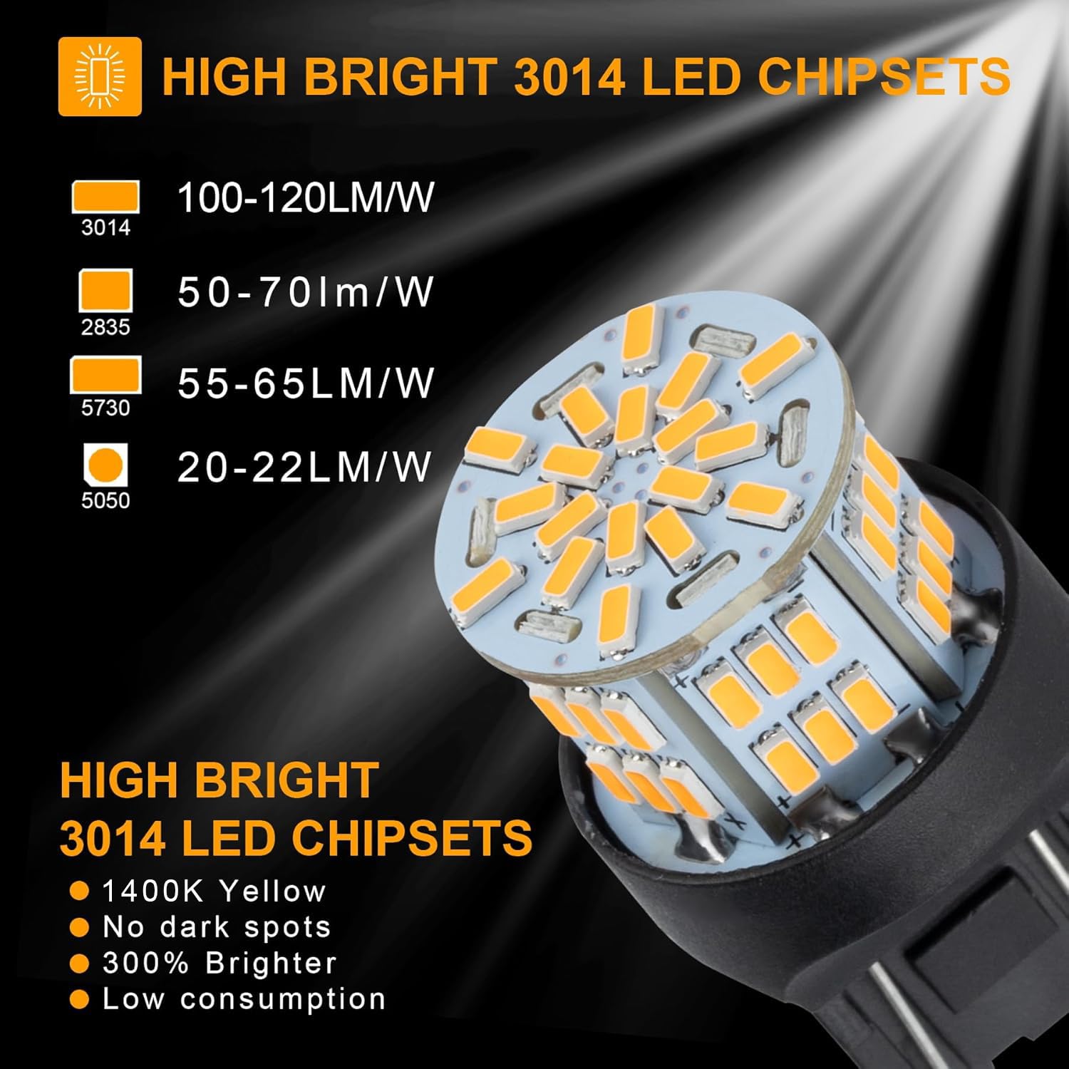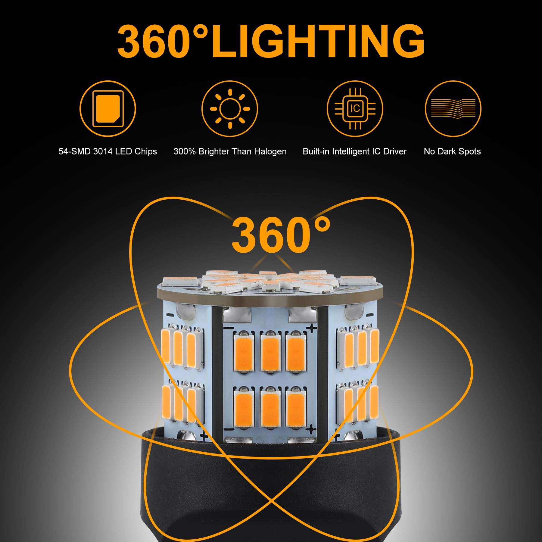 300% Brighter: Our 7443 bulb has 54 pieces of 3014 led chips on it, 360 degree lighting angle, no blind spot.