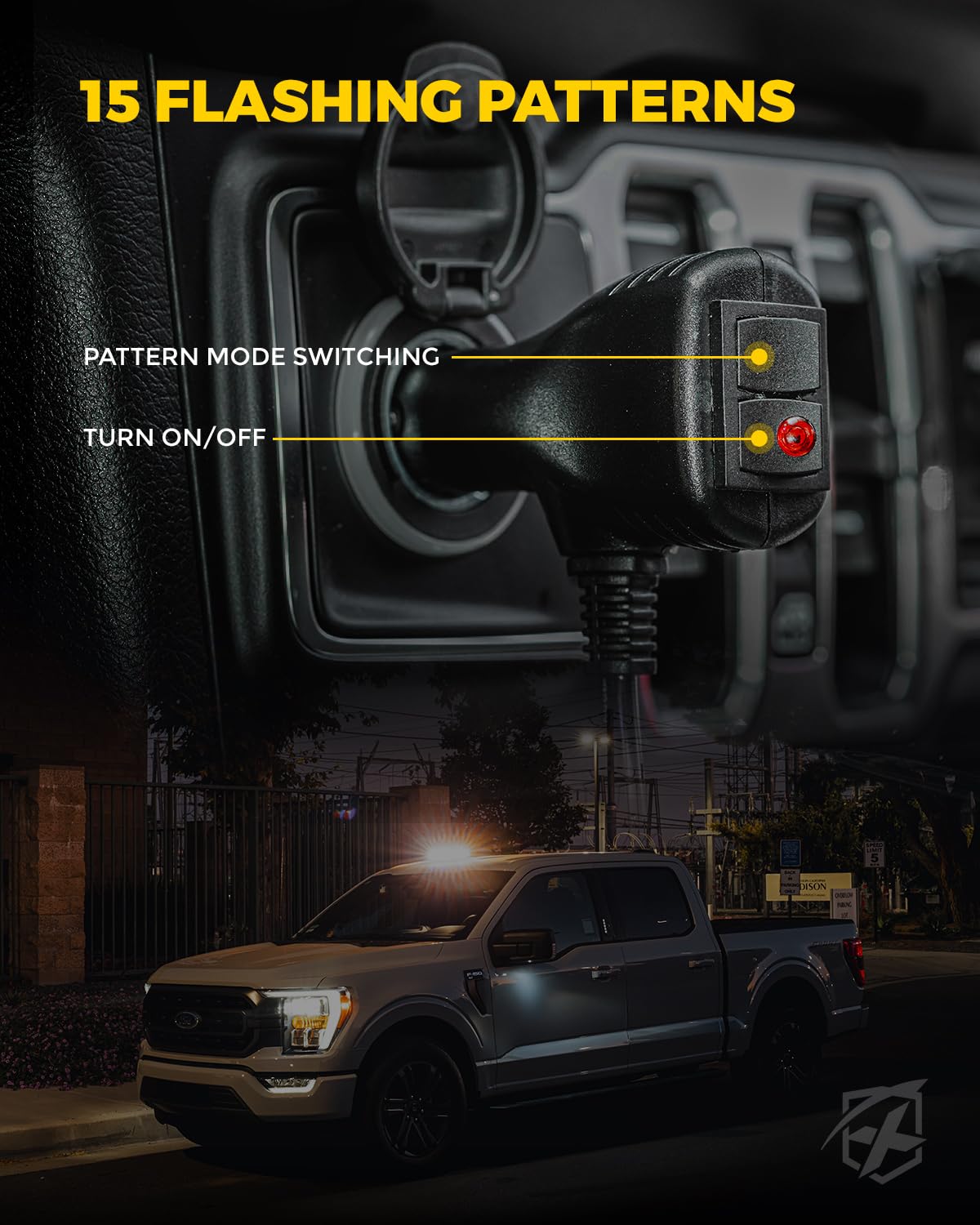 15 STROBE FLASH PATTERNS - 12V cigarrette plug with convenient dual switch design. 1 for easy power on/off. 2nd to change between 15 different flash modes, includes last pattern memory recall. Patterns include Rotating, Flashing, Alternating Between Left and Right Side, etc. These modes are sure to provide caution to potential upcoming hazards.