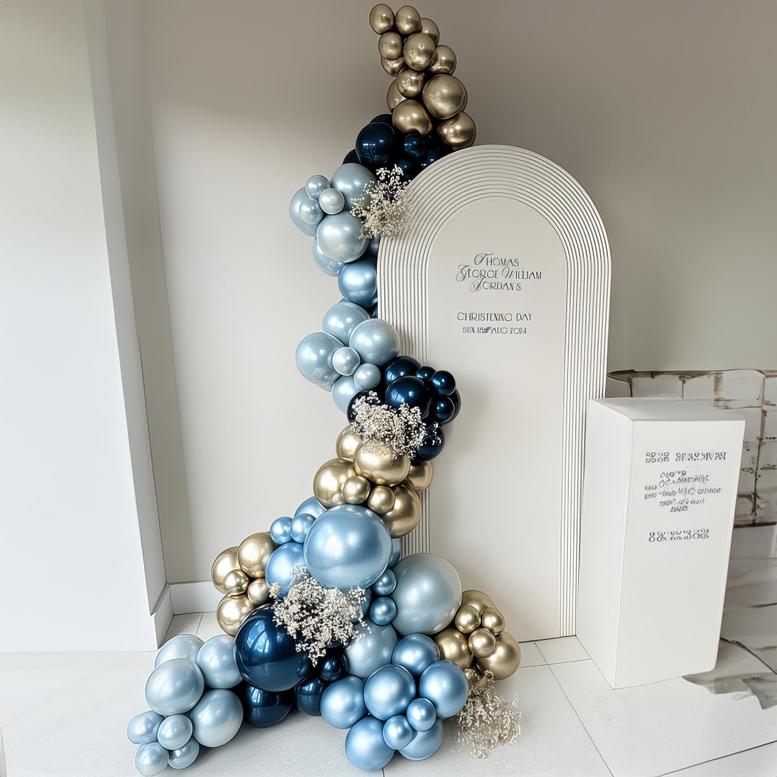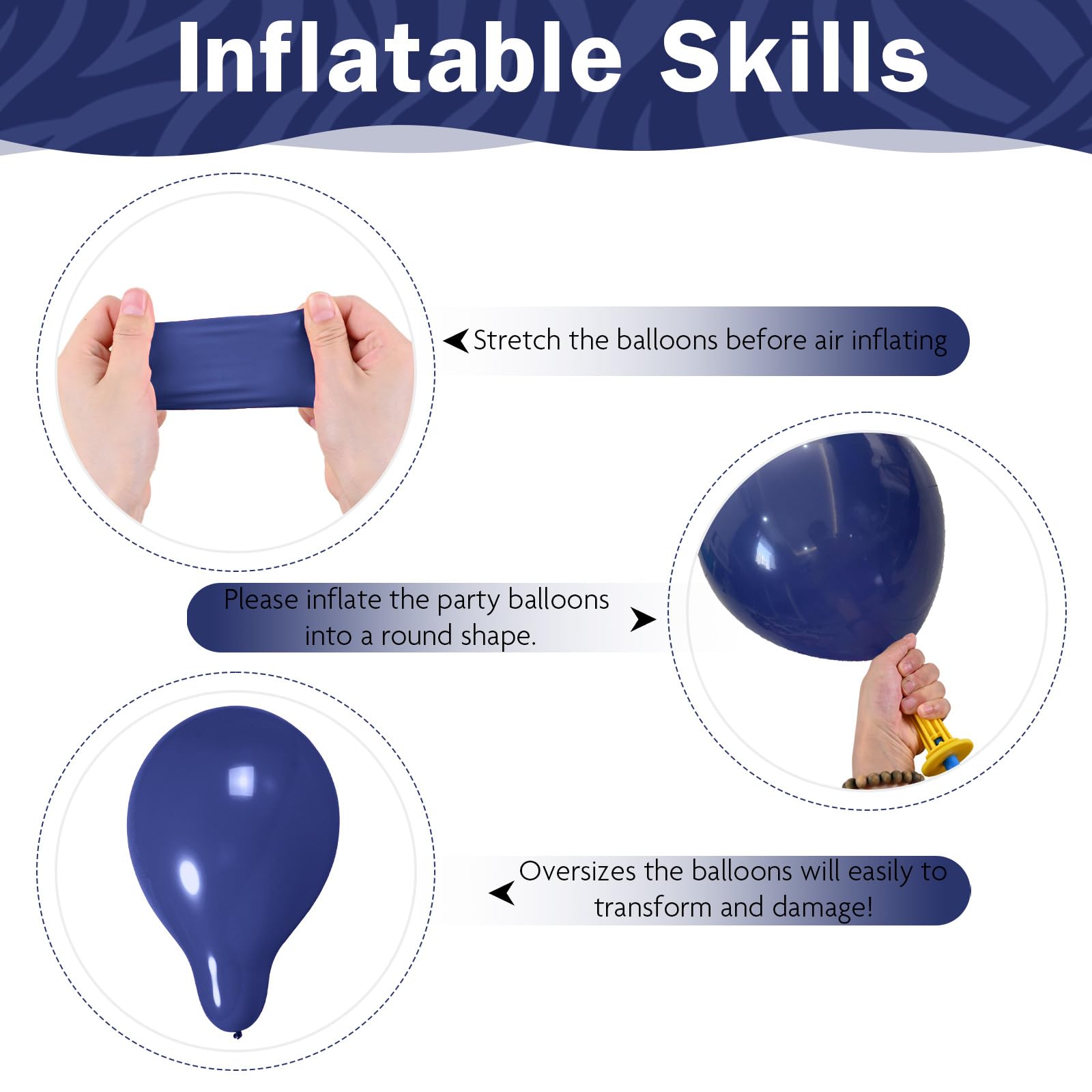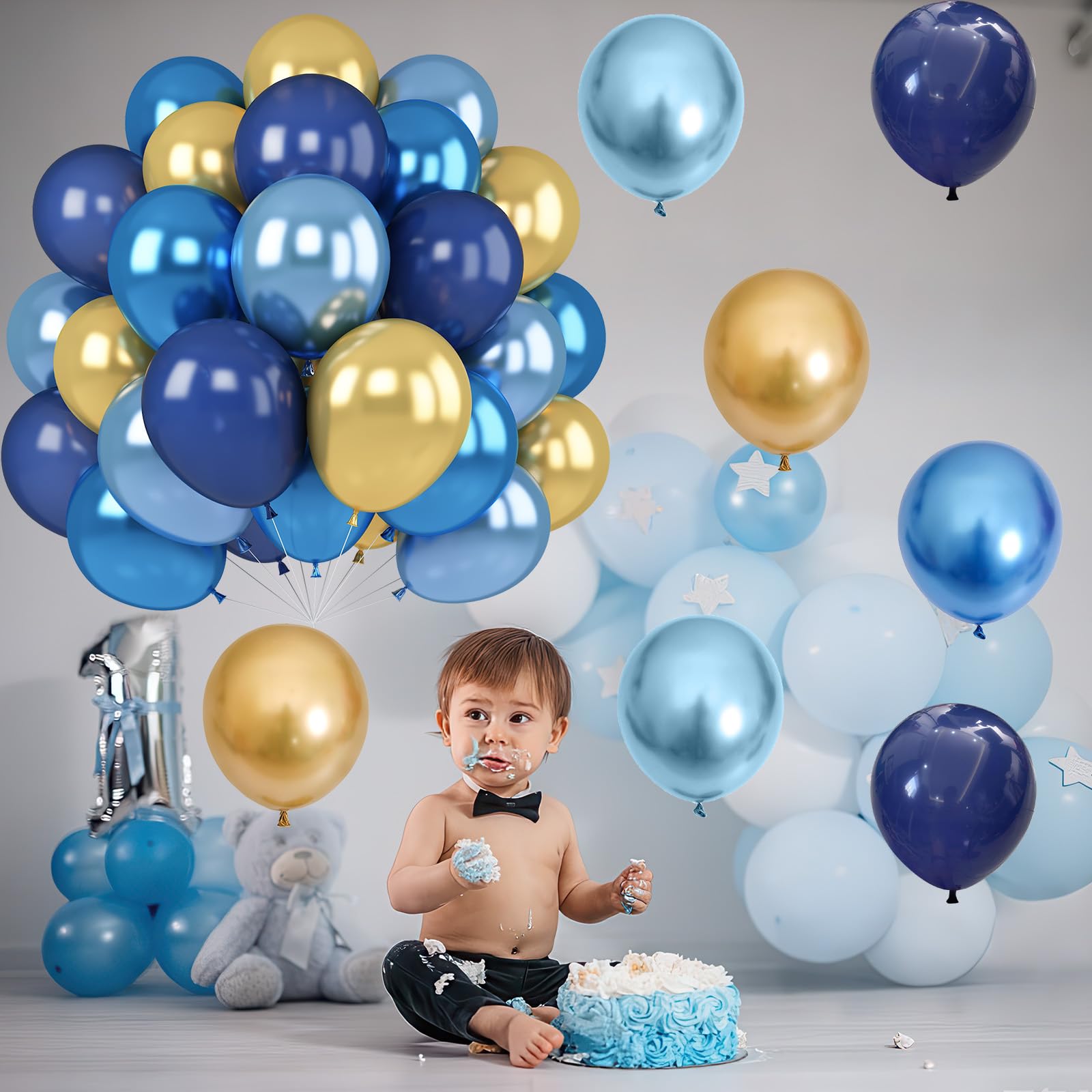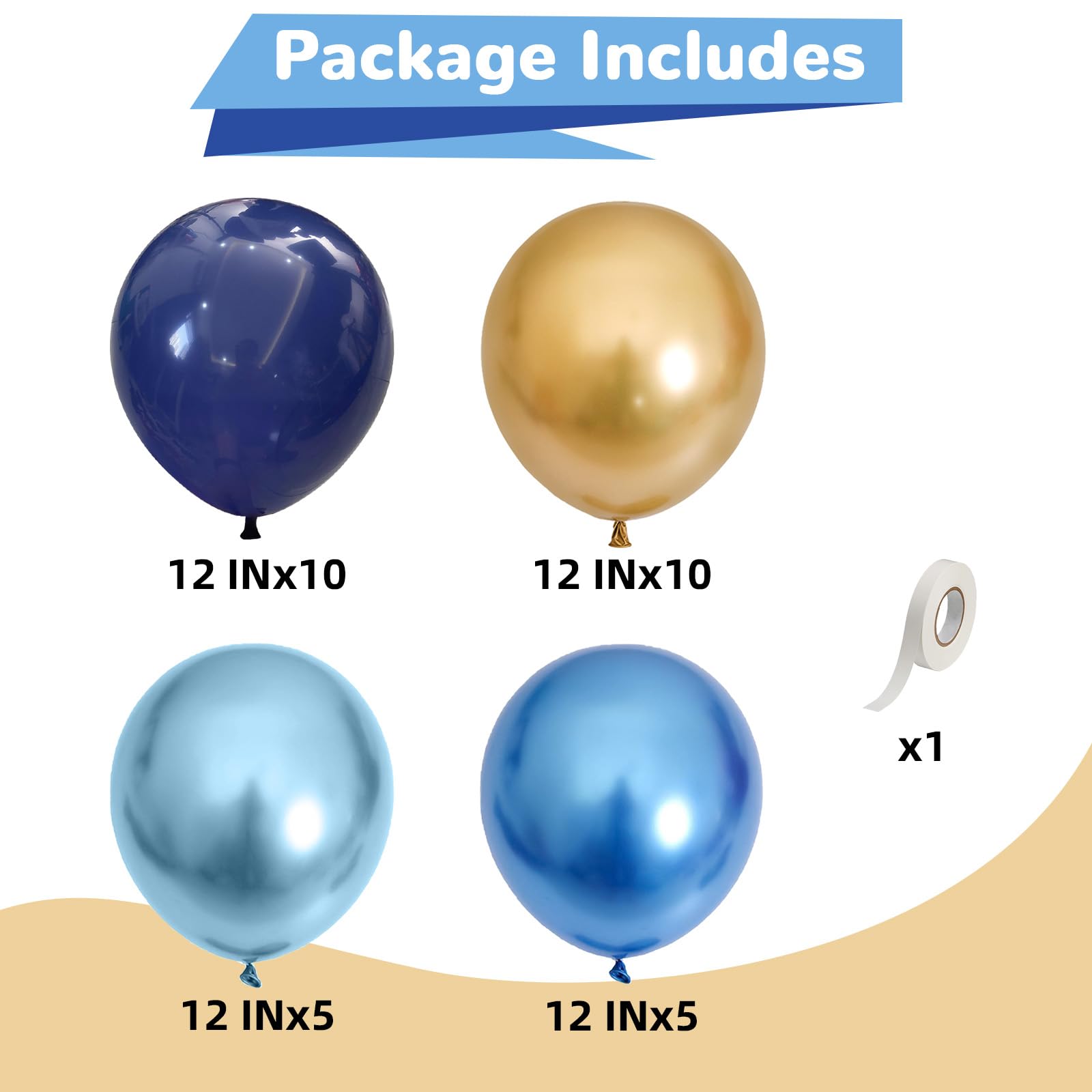 Variety of Colors: Includes 12 inch 10 pcs pearl navy balloons, 12 in 10 pcs metallic gold balloons, 12 in 5 pcs metallic baby blue balloon, 12 in 5 pcs chrome blue helium balloons