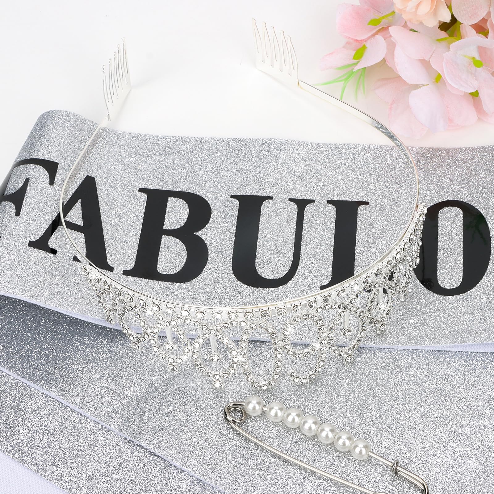 Silver Birthday Sash: Made of high quality glitter fabric and printed with black foil words reads “60 & FABULOUS”.Elegant and gorgeous!The sash is in 61 inch length and 3.7 inch width,and comes with a pretty pin to adjust the size