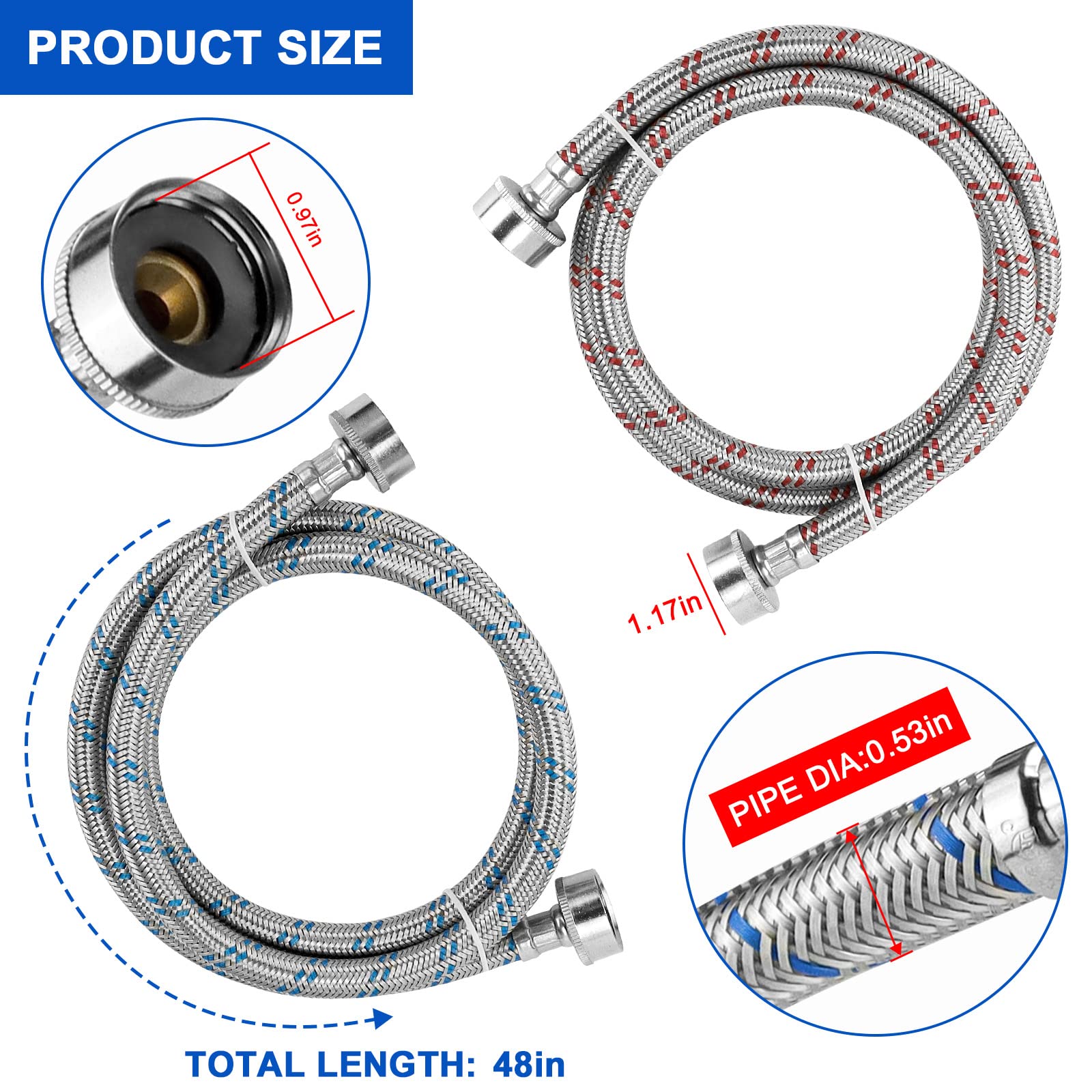 [𝗛𝗼𝘁 & 𝗖𝗼𝗹𝗱 𝗪𝗮𝘁𝗲𝗿 𝗪𝗮𝘀𝗵𝗲𝗿 𝗛𝗼𝘀𝗲] Each package includes 1 x blue washer water supply hose and 1 x red washer water supply hose, each hose has an working temperature range of 15°F - 158°F, which can be used in both high and low temperature environments. Extra thick rubber gasket fits the hot and cold water washing machine hose perfectly and provides a leak-free seal