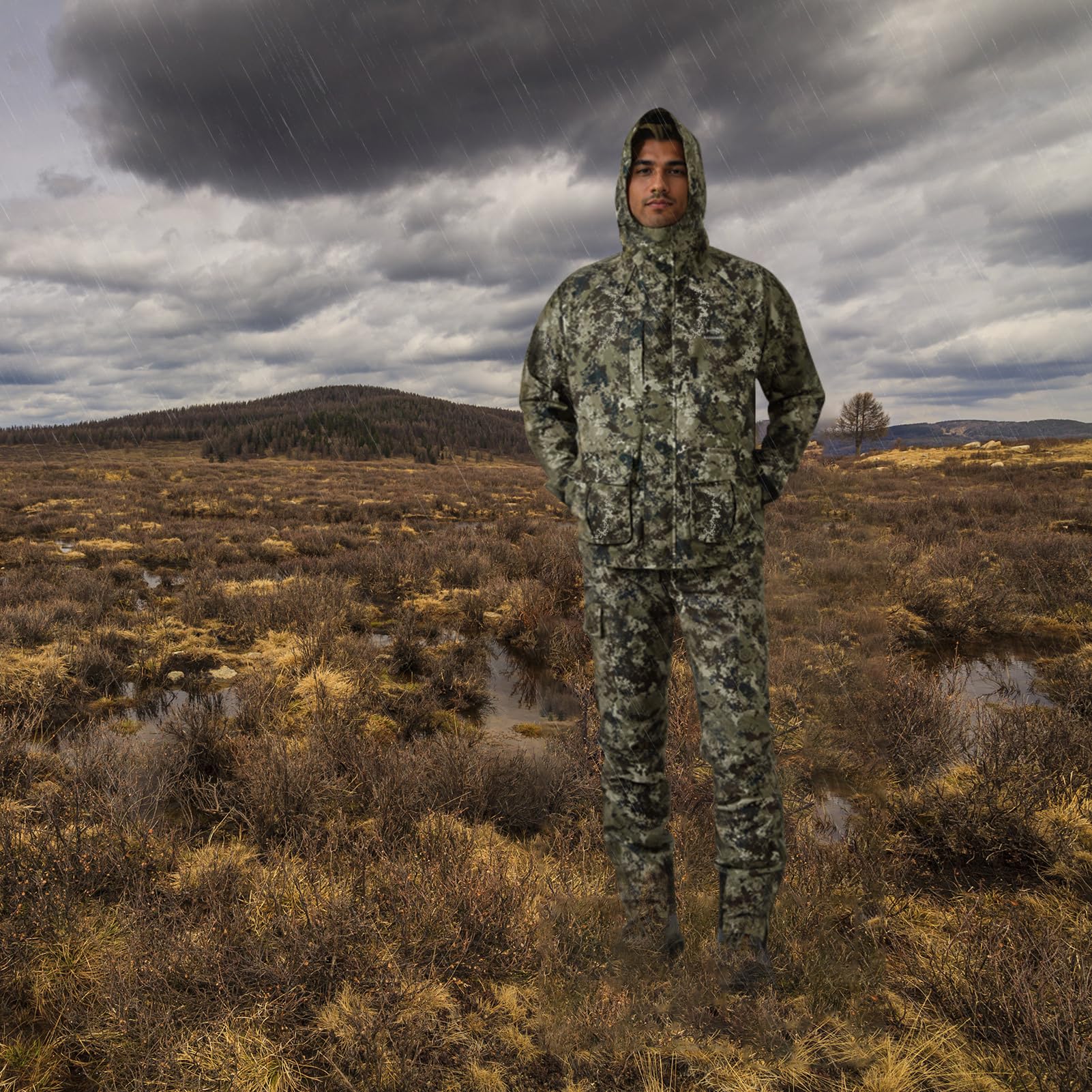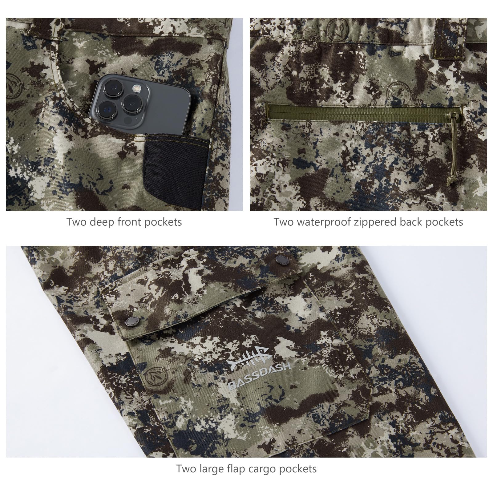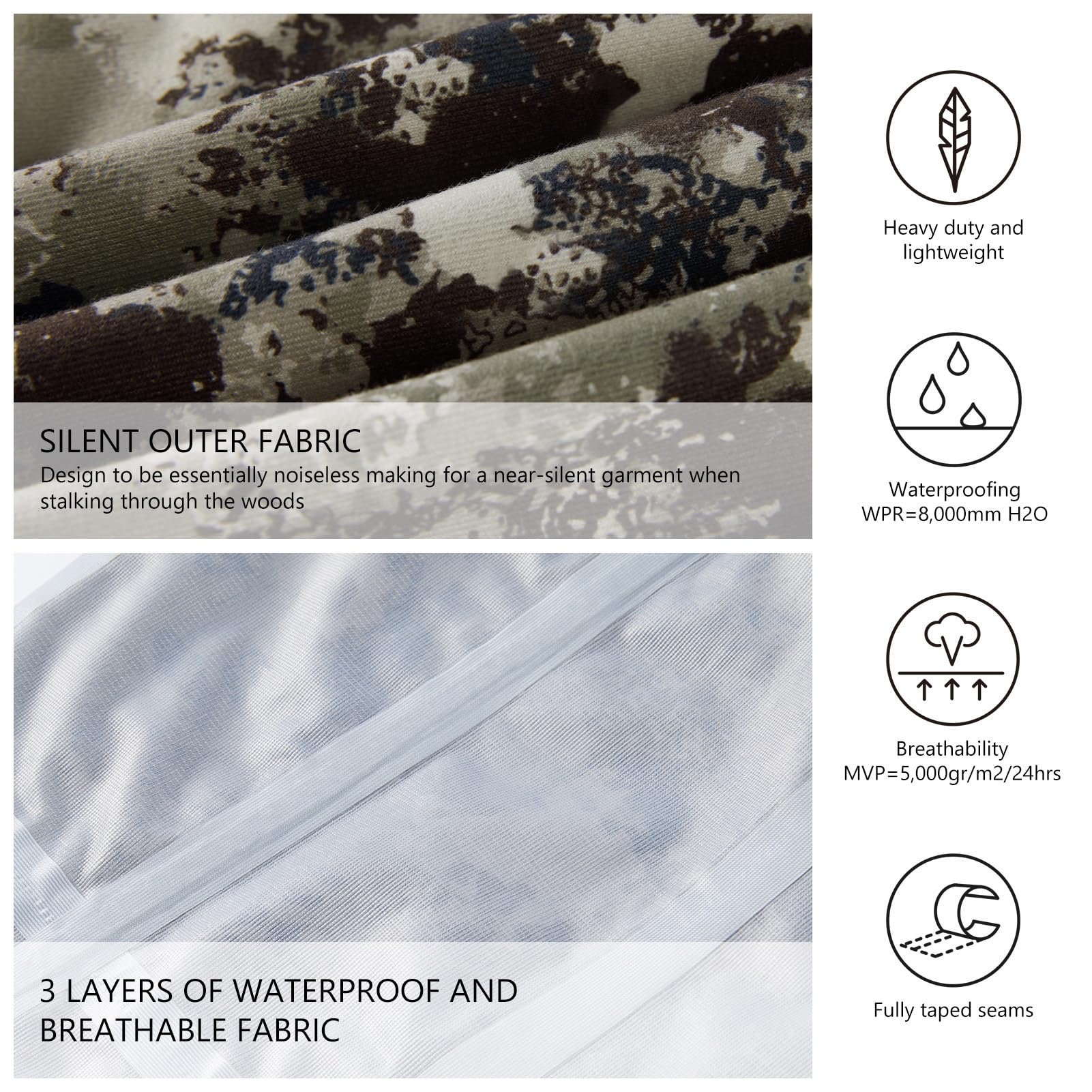 The hunting pants are made of 3 layers of fabric that are both heavy-duty and lightweight, along with fully taped seams, the pants are waterproof and breathable. Outer fabric has been designed to be noiseless, so you can move silently through the woods