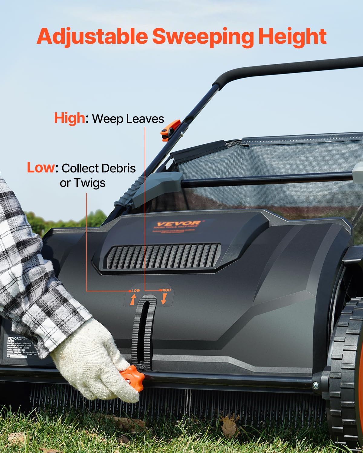 Adjust to Any Terrain: The lawn sweep is designed with an adjustable spinning brush height–simply adjust the knob by hand to move brushes up and down without the need for any special tools. You can use it on any terrain, whether it's a sidewalk, driveway, yard, or garden.
