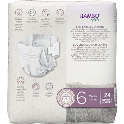 Bambo Nature Dream disposable diapers are the first baby diapers certified with the Nordic Swan Ecolabel, and now the fluff pulp is made TCF (totally chlorine-free). As always, they are free of over 2500 harmful chemicals and known allergens. Our diapers have a unique three-layer design and super-absorbent core that can stand up to multiple wettingsβeven overnight. Combined with our fully breathable backsheet, baby's sensitive skin will stay dry and comfortable. A wetness indicator changes color to indicate when a change is needed and our flexible, waistband and latex-free leg cuffs help diapers stay in place while maximizing movement so your child can boot, scoot and boogie all day long.
