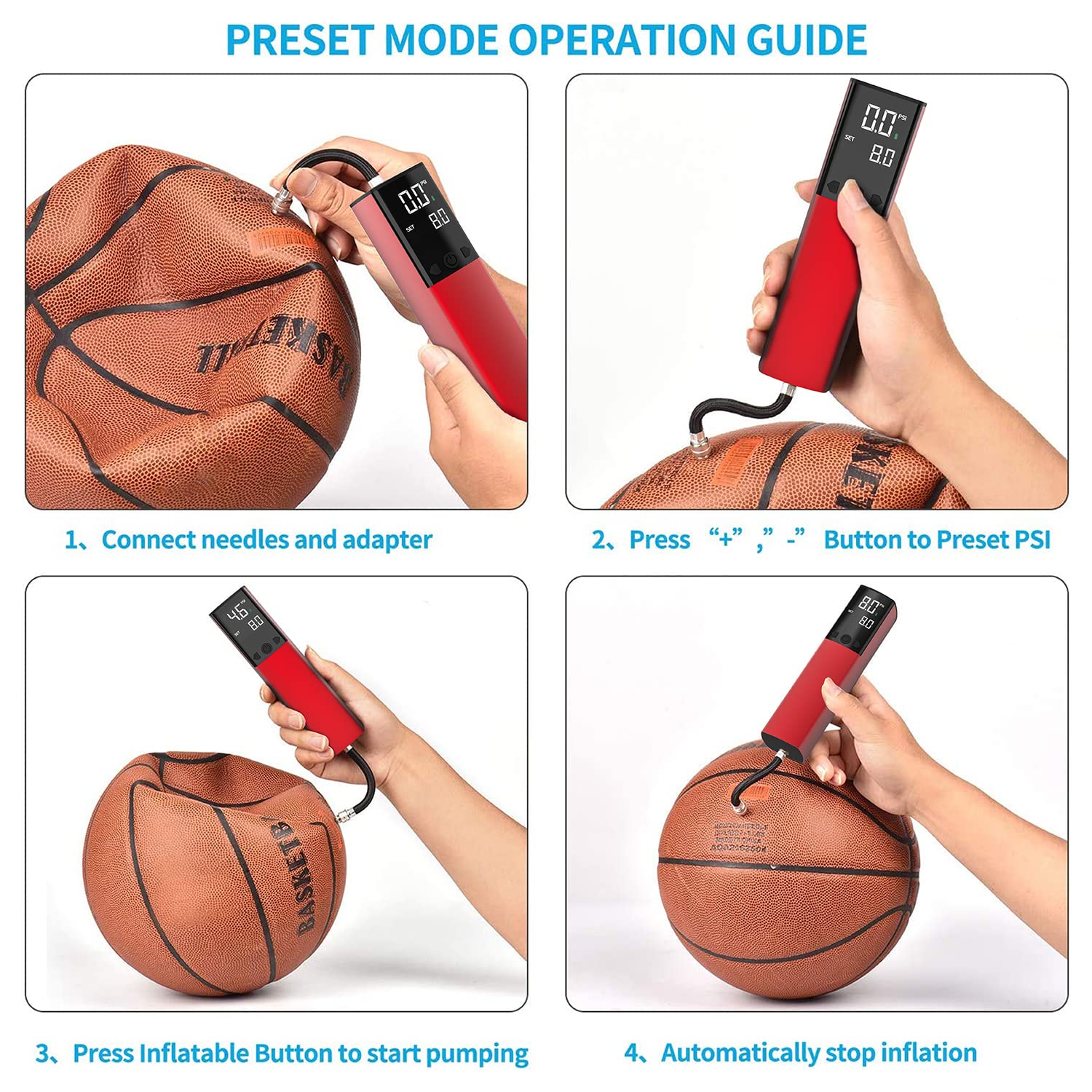 Automatic Electric Ball Pump:Electric Ball Pump designs with intelligent pressure detection and stop function,just preset the correct ball PSI,press to start and it will automatically stop inflating once the preset pressure is reached. Smart and easy to use
