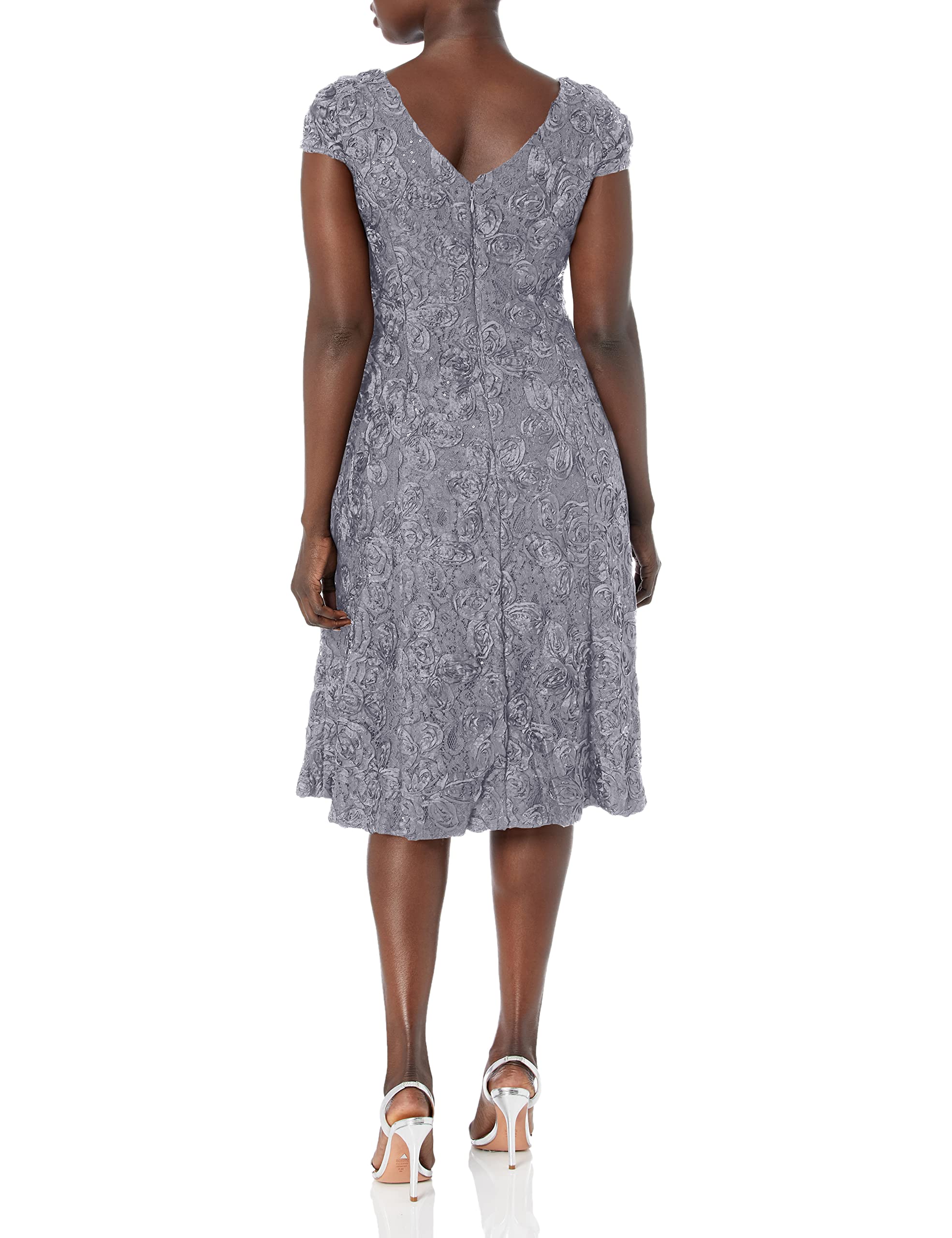 Tea-Length Elegance: A-line dress with rosette lace and sequins, offering a perfect blend of glamour and sophistication for formal occasions.