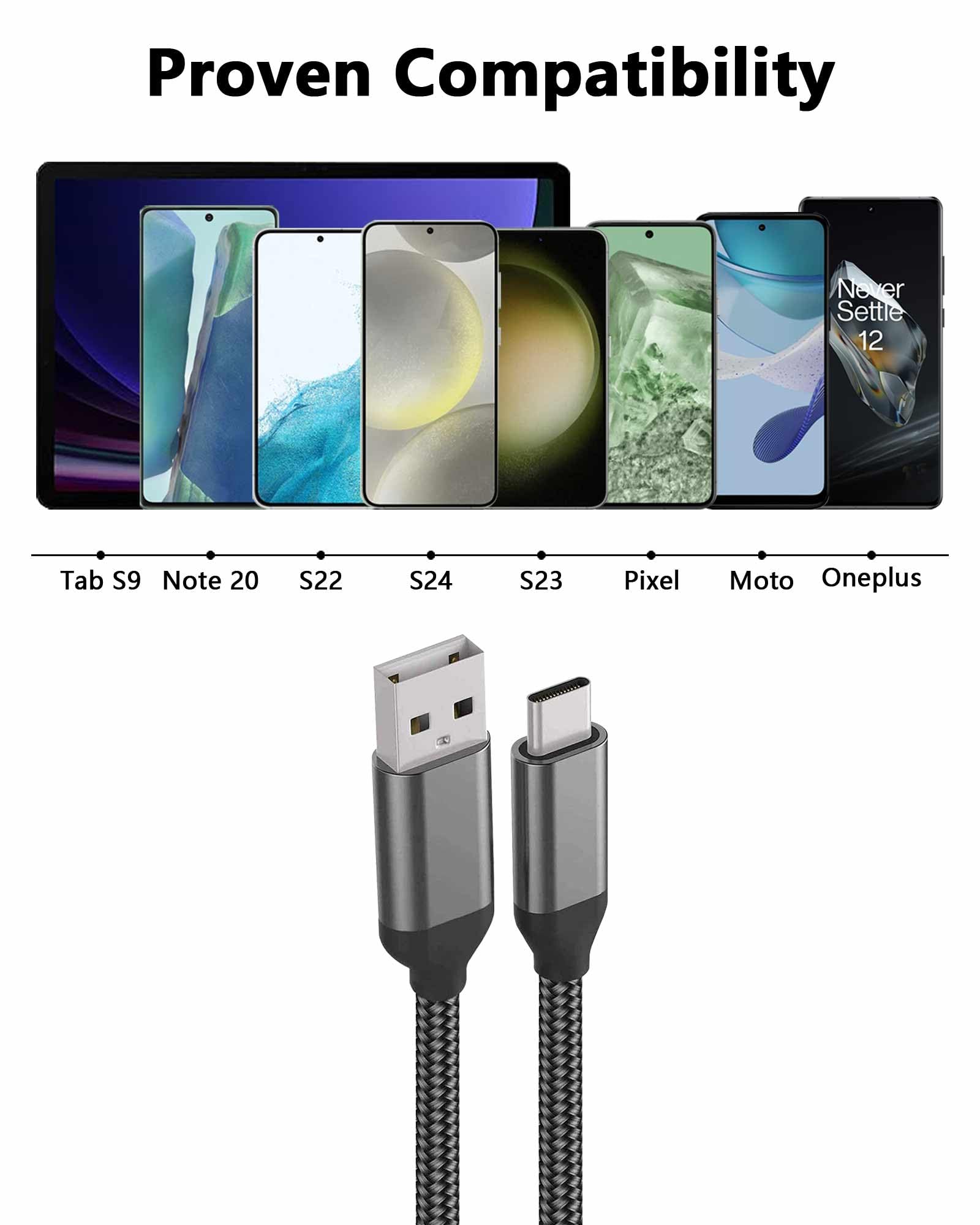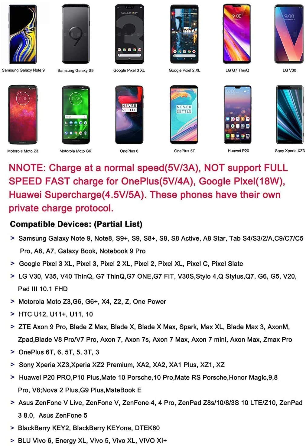 【USB-C Compatibility】 Partial List: Samsung Galaxy S10e S10 S9 S8 Plus,Note 9 8,S8 Active,A10e A80 A70 A50 A30 A20 Tab S6 S5e S4 S3,Tab Active Pro,Galaxy Book Book2;Google Pixel 3 XL 3a 2 X;LG Stylo 5 4 G8 G7 ThinQ G6 Q7+;Motorola Moto Z4 Z3 G7 Plus X4 One Power Zoom Action;ZTE Axon 10,Blade Z Max XL,Zpad;ZenFone V Live 6,ZenPad Z10;Gopro Hero 7;Razer 2;★★★NOTE: NOT SUPPORT FULL SPEED FAST CHARGE for OnePlus, Google Pixel, MacBook. NOT WORK FOR LG Stylo 2/3, BUT WORK FOR LG Stylo 4/5