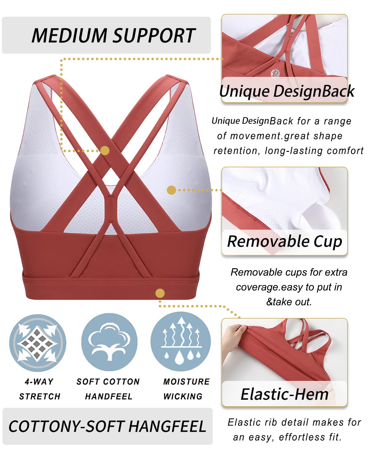 CRISS-CROSS BACK FULL COVERAGE DESIGN:Sexy back bringing more attention to the crisscross double strap back feature.Elastic Double Strap Bra features a sultry full coverage and double layer fabric for enough added support.Stretch Fit Sports Yoga Gym Bra Push up & Padded with removable pads for convenient adjustment, with a cotton-like meterial, soft and comfortable to wear.