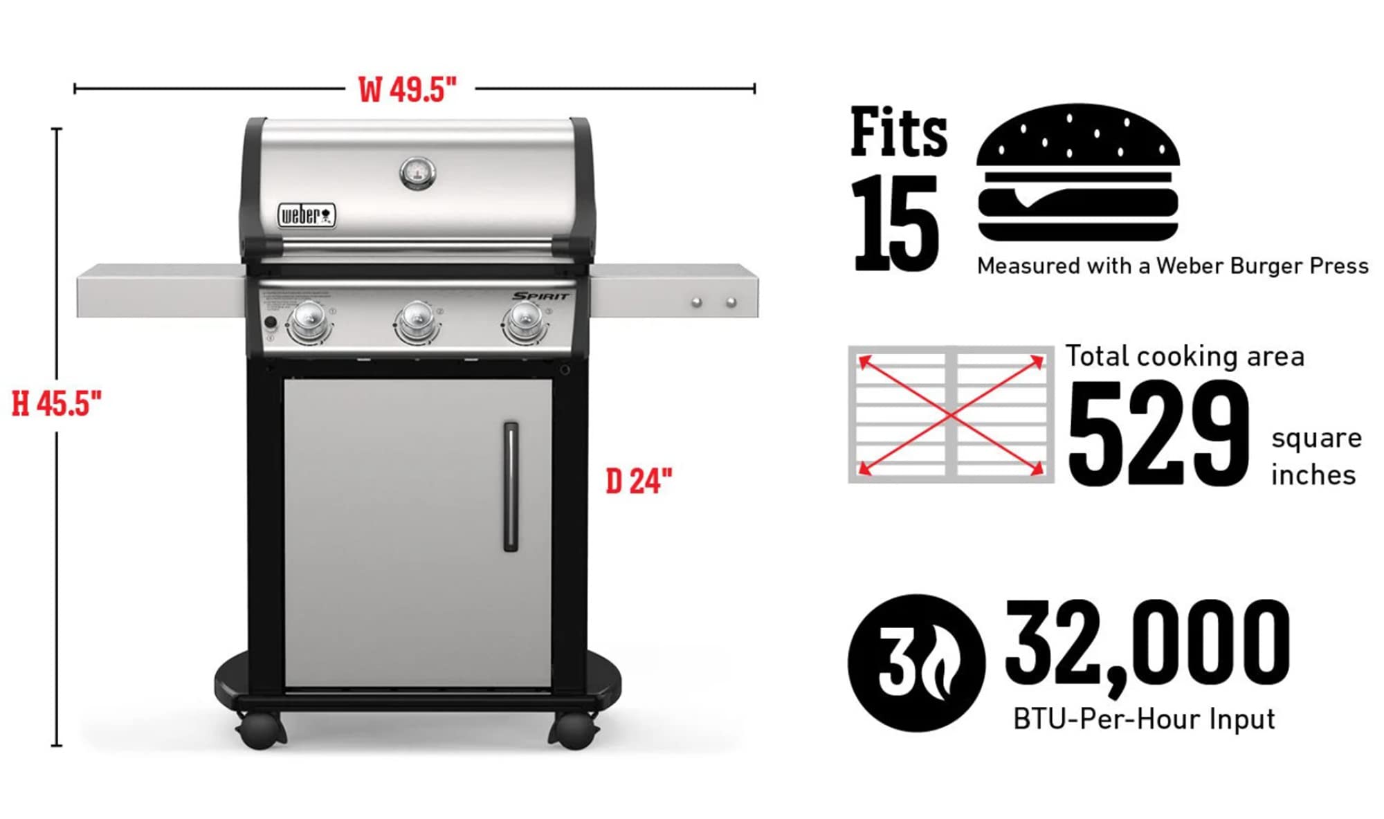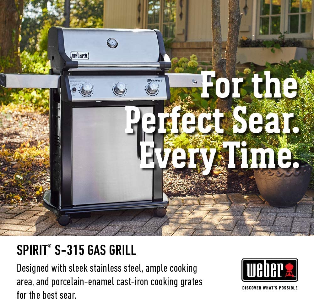 The three-burner Spirit S-315 gas grill is ideal for entertaining a crowd. Use the convenient side tables for placing serving trays, while grilling tools hang from the tool hooks. Designed with a sleek stainless-steel finish and ample cooking area. The porcelain-enamel cast-iron cooking grates are durable, easy to clean, and retain heat for the perfect sear. It’s the perfect answer to any meal.