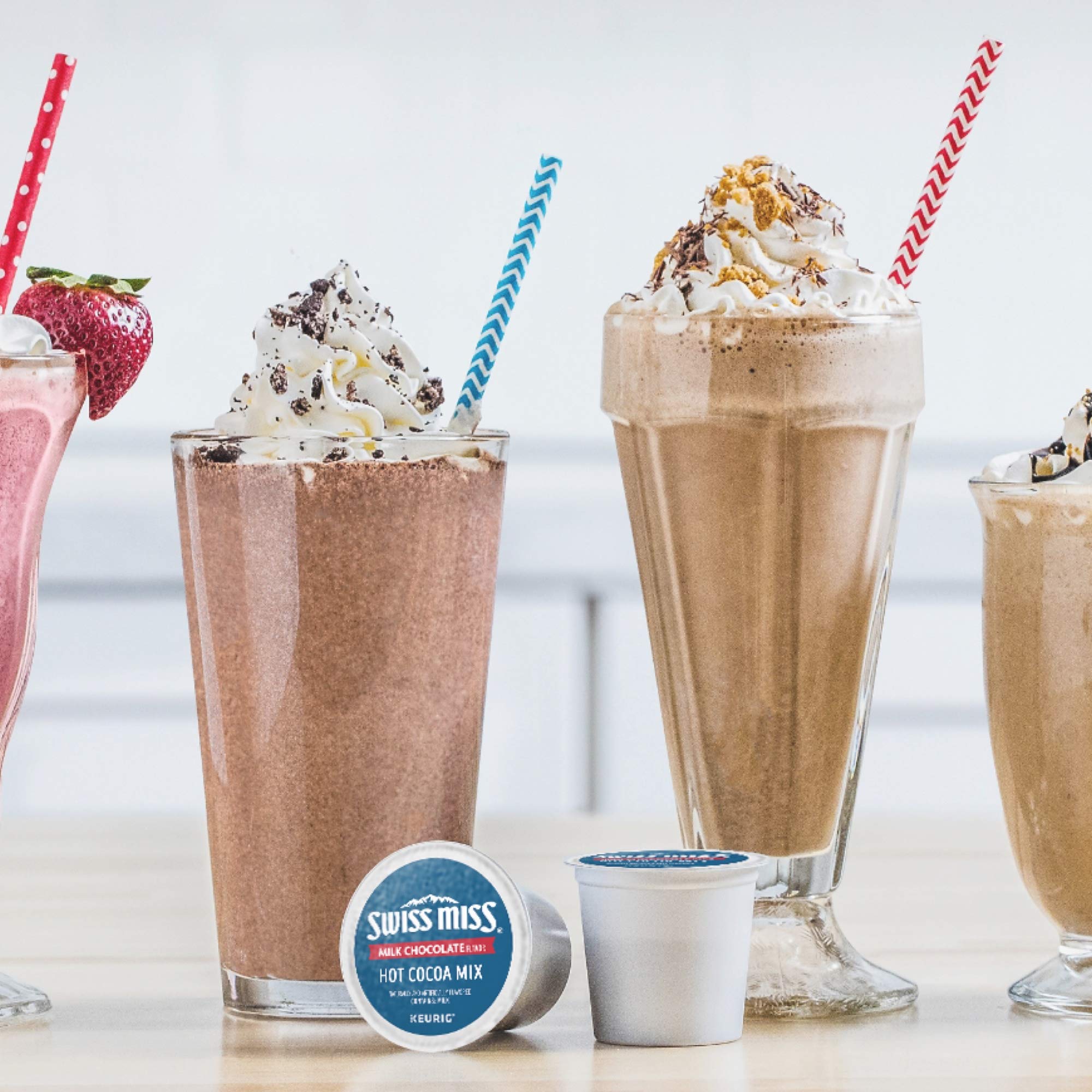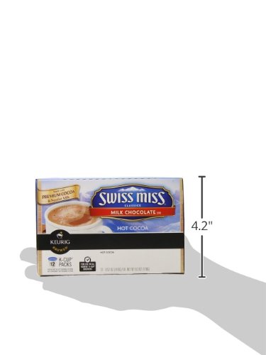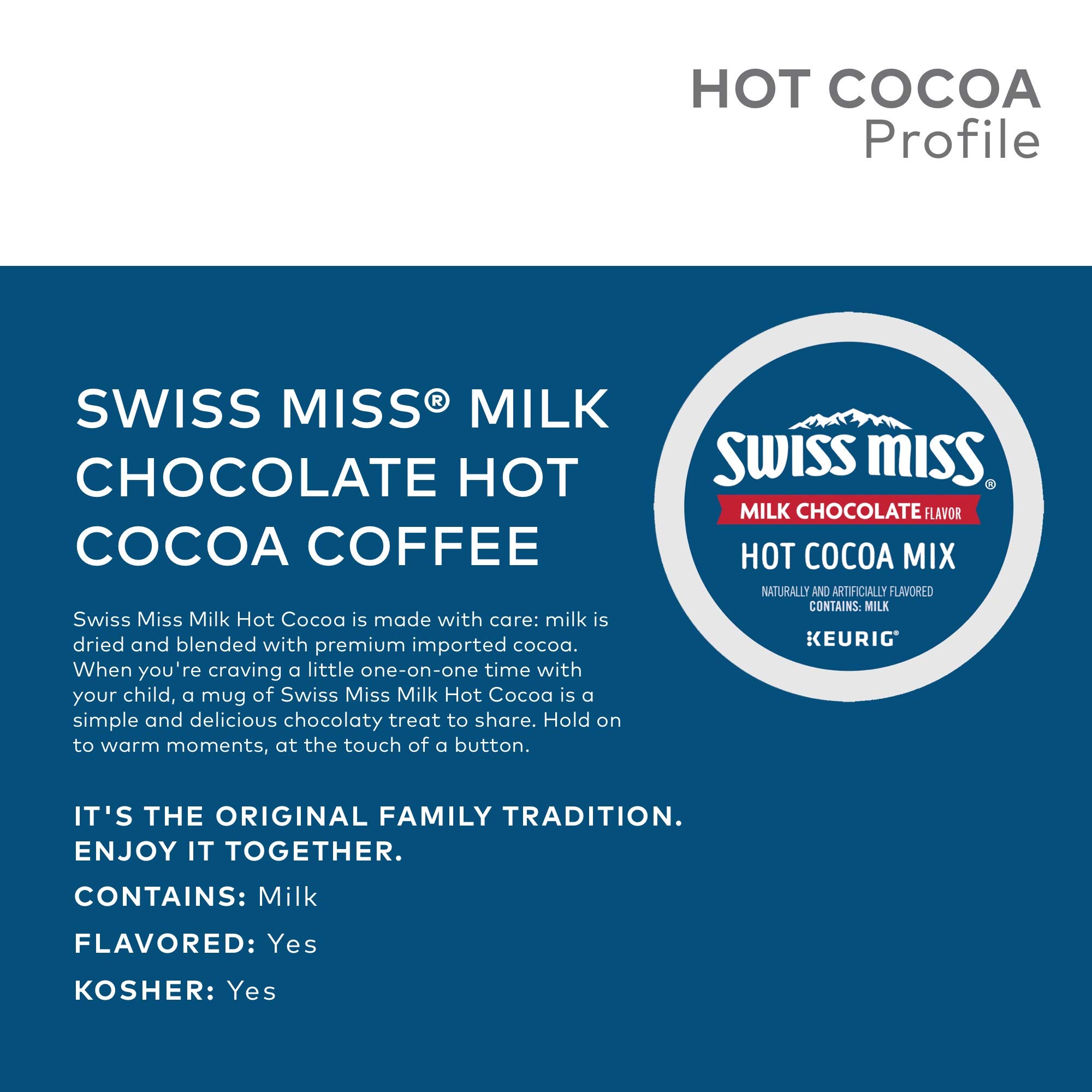 VARIETY DESCRIPTION: Swiss Miss Milk Chocolate cocoa mix is made with care in a real dairy where milk from local farms is delivered daily, dried & blended with premium, imported cocoa. ABOUT SWISS MISS: When you're craving a little one-on-one time with your child, a mug of Swiss Miss hot cocoa is the simple, delicious way to share a moment. It's the original family tradition. Enjoy it Together! INGREDIENTS: CORN SYRUP, SUGAR, COCOA (PROCESSED WITH ALKALI), HYDROGENATED COCONUT OIL, NONFAT MILK, SALT, LESS THAN 2% OF DIPOTASSIUM PHOSPHATE, DEXTROSE, MONO- AND DIGLYCERIDES, ACESULFAME POTASSIUM, CARRAGEENAN, NATURAL AND ARTIFICIAL FLAVOR, SUCRALOSE. CONTAINS: MILK FOR BEST RESULTS: 1. Store at room temperature. 2. Use the 8-oz. setting on your brewer. 3. Run a hot water brew cycle (without a K-Cup pack) after brewing. WARNING: NOT FOR USE BY CHILDREN WITHOUT ADULT SUPERVISION. Potential for exposure to very hot liquid. PACKAGING CHANGE: In the next few months you may notice a change to the K-Cup pack lids. We have provided an image of the current K-Cup pack lid design, as well as the new K-Cup pack lid design. Please note the product ingredients have not changed.