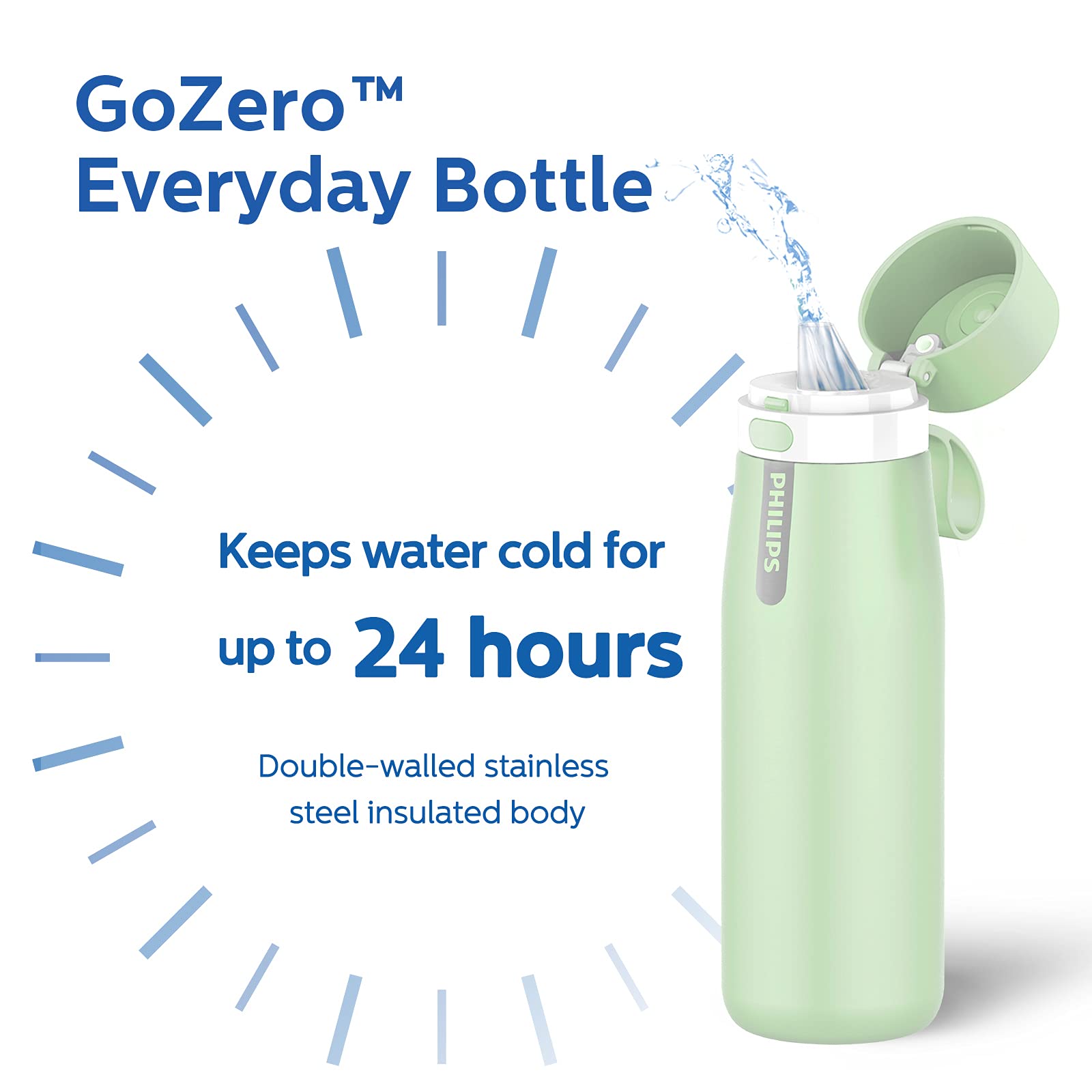 ★ 𝐊𝐞𝐞𝐩 𝐈𝐭 𝐂𝐨𝐨𝐥: Thanks to its double-wall insulated body, this water bottle can keep your water cold for up to 24 hours. The silicone mouthpiece allows you to easily sip water without compromising the water flow ★ 𝐆𝐨𝐨𝐝 𝐟𝐨𝐫 𝐄𝐧𝐯𝐢𝐫𝐨𝐧𝐦𝐞𝐧𝐭: By using the Philips GoZero Everyday filter bottle, you can help save the environment by replacing up to 450 single-use plastic bottles with just one reusable bottle. This not only lowers your carbon footprint but also contributes to a healthier planet.