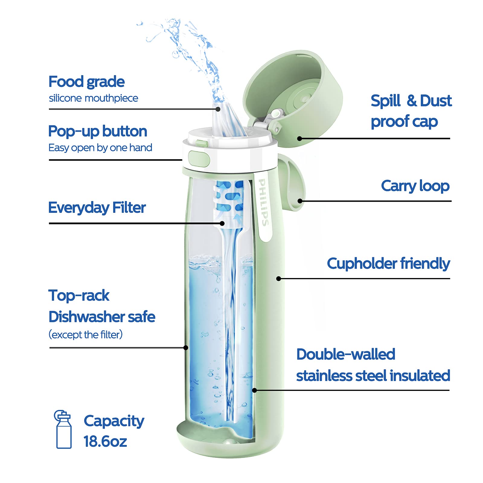 ★ 𝐃𝐞𝐬𝐢𝐠𝐧𝐞𝐝 𝐖𝐢𝐭𝐡 𝐘𝐨𝐮𝐫 𝐂𝐨𝐧𝐯𝐞𝐧𝐢𝐞𝐧𝐜𝐞 𝐢𝐧 𝐌𝐢𝐧𝐝: This leak-proof filtered water bottle is designed with a built-in carry loop and a cup-holder friendly size, making it easy to take with you on-the-go. It is also top-rack dishwasher safe for easy cleaning. The pop-up lid is designed to be opened easily with one hand, allowing for convenient access to your water.★ 𝐃𝐢𝐬𝐡𝐰𝐚𝐬𝐡𝐞𝐫 𝐒𝐚𝐟𝐞 𝐃𝐞𝐬𝐢𝐠𝐧 (except the filter).