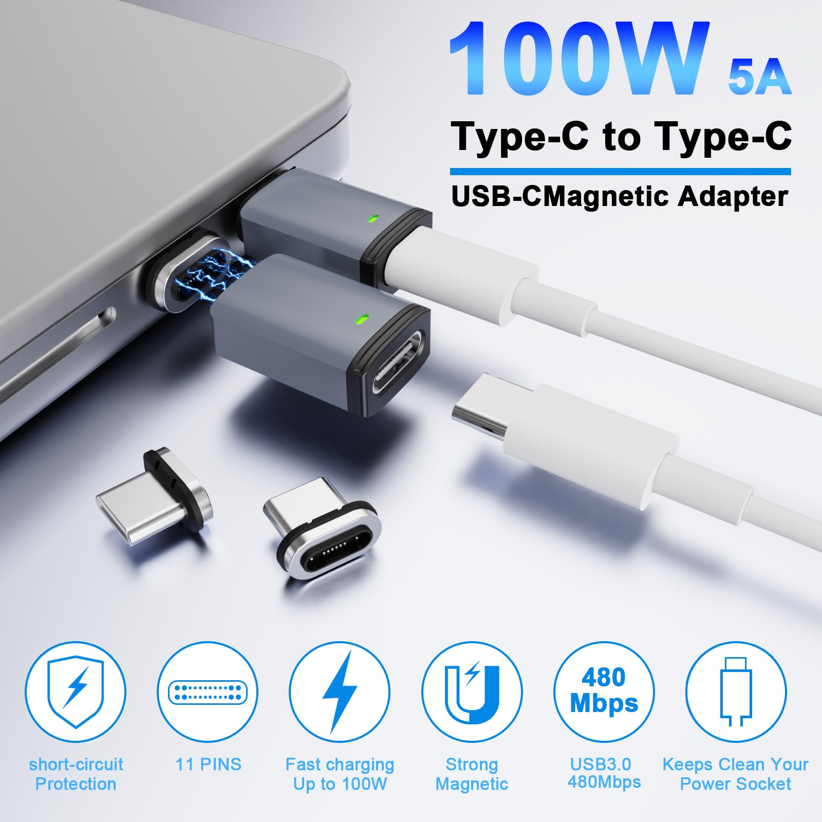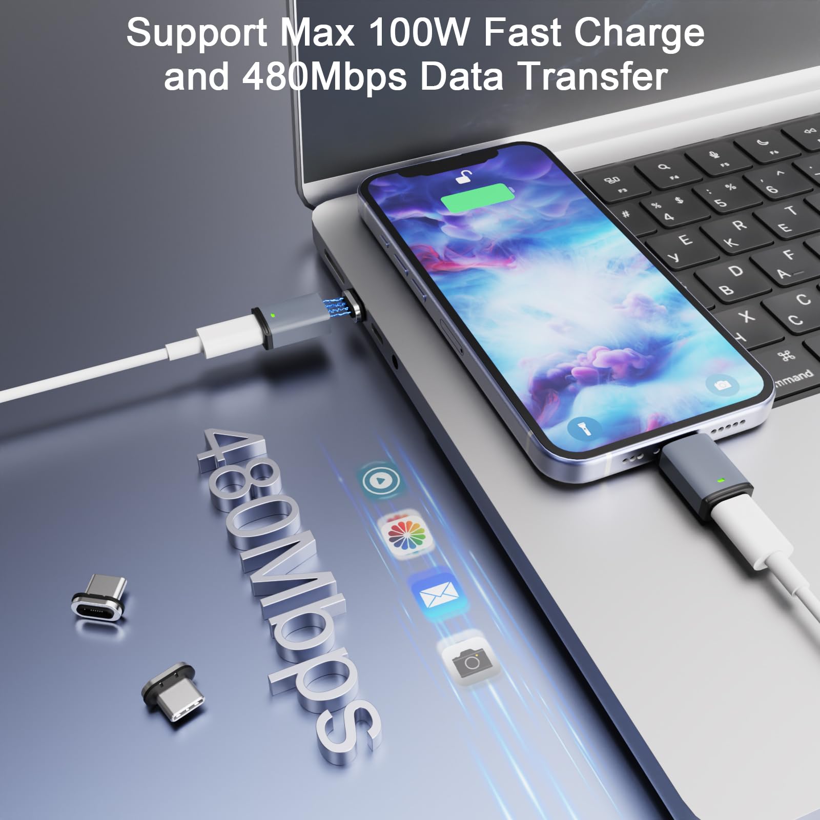 EXCELLENT PERFORMANCE: Our USB C magnetic adapter supports 100W PD fast charging, 480mbps data transfer, which utilizes USB Power Delivery (USB PD3.0) technology to support device requirements from 5V/3A to 20V/6A (up to 120W). Actual charging and transfer rates depend on the USB-C cable used with it.