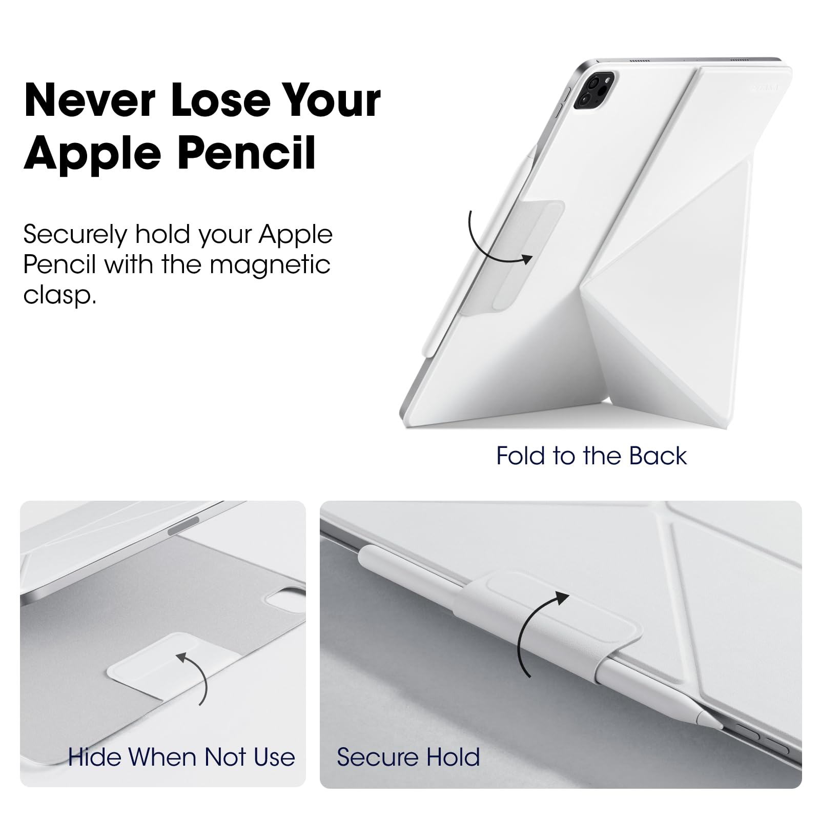 [Magnetic Design & Built-in Pencil Holder] The Powerful magnets hold your tablet firmly. (Note: Magnetic Design - Does Not Cover iPad Edges.) Use the magnetic clasp to secure your Apple Pencil. Or fold and hide it when not used. You may attach and charge your Apple Pencil 2 as usual.
