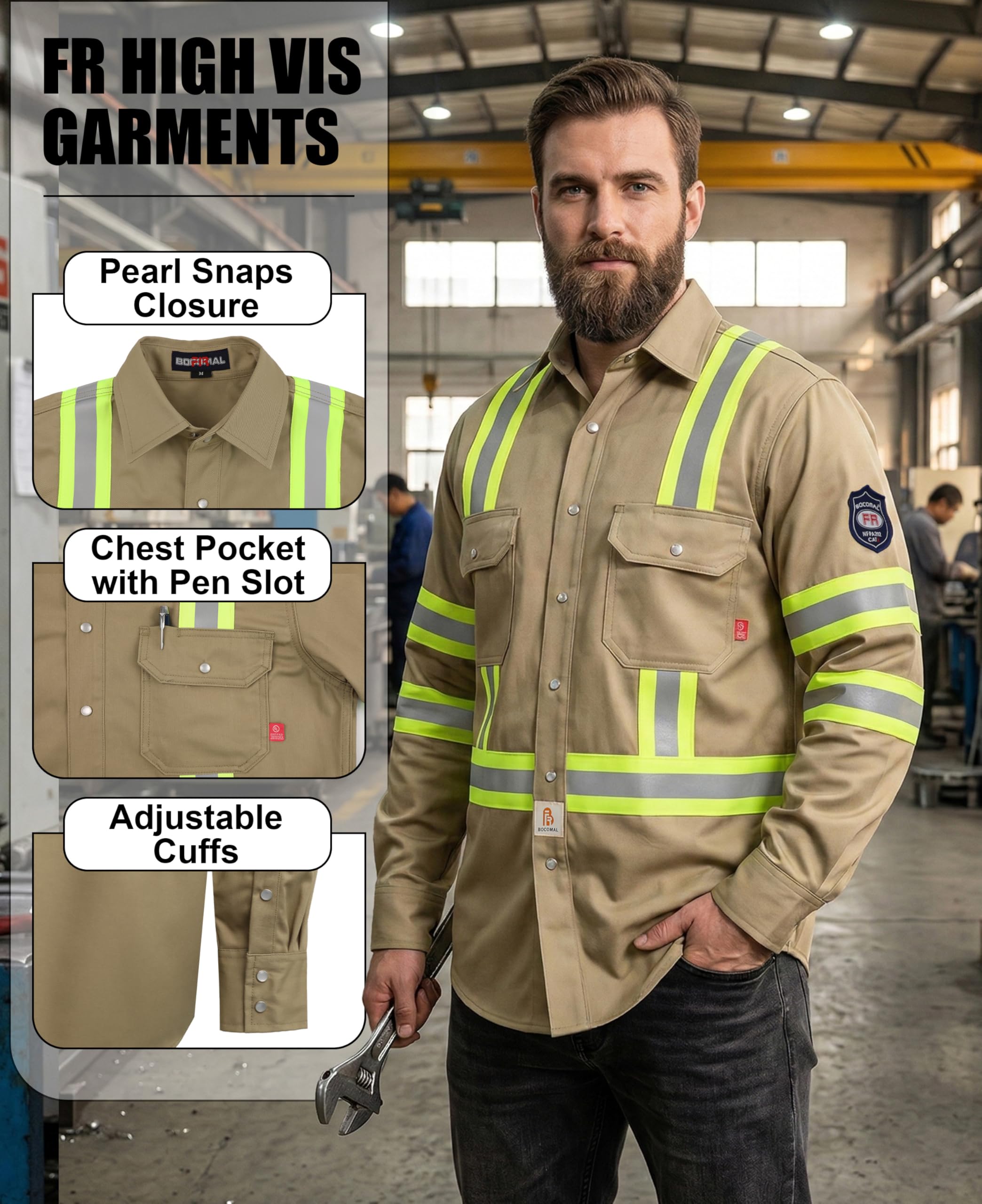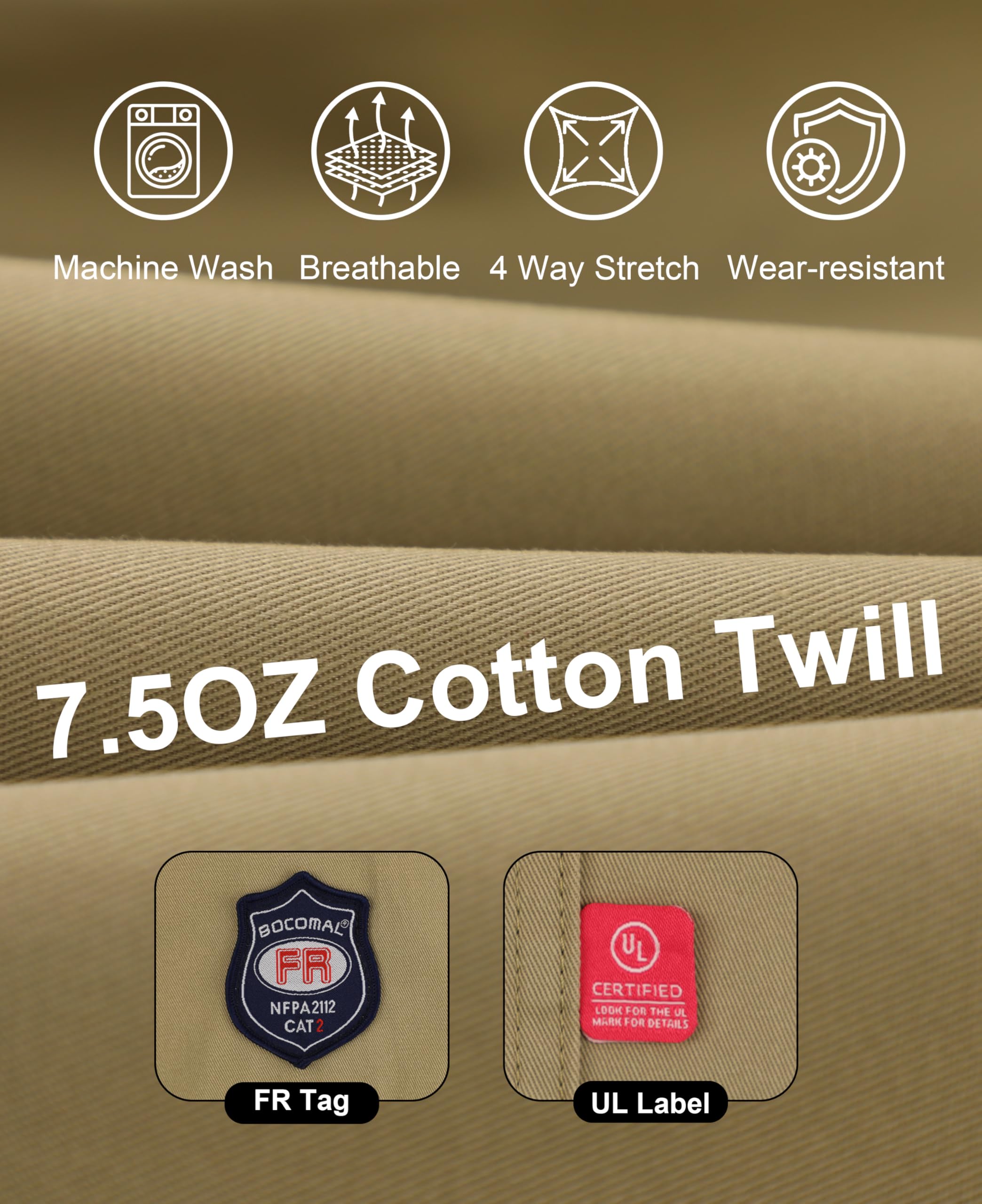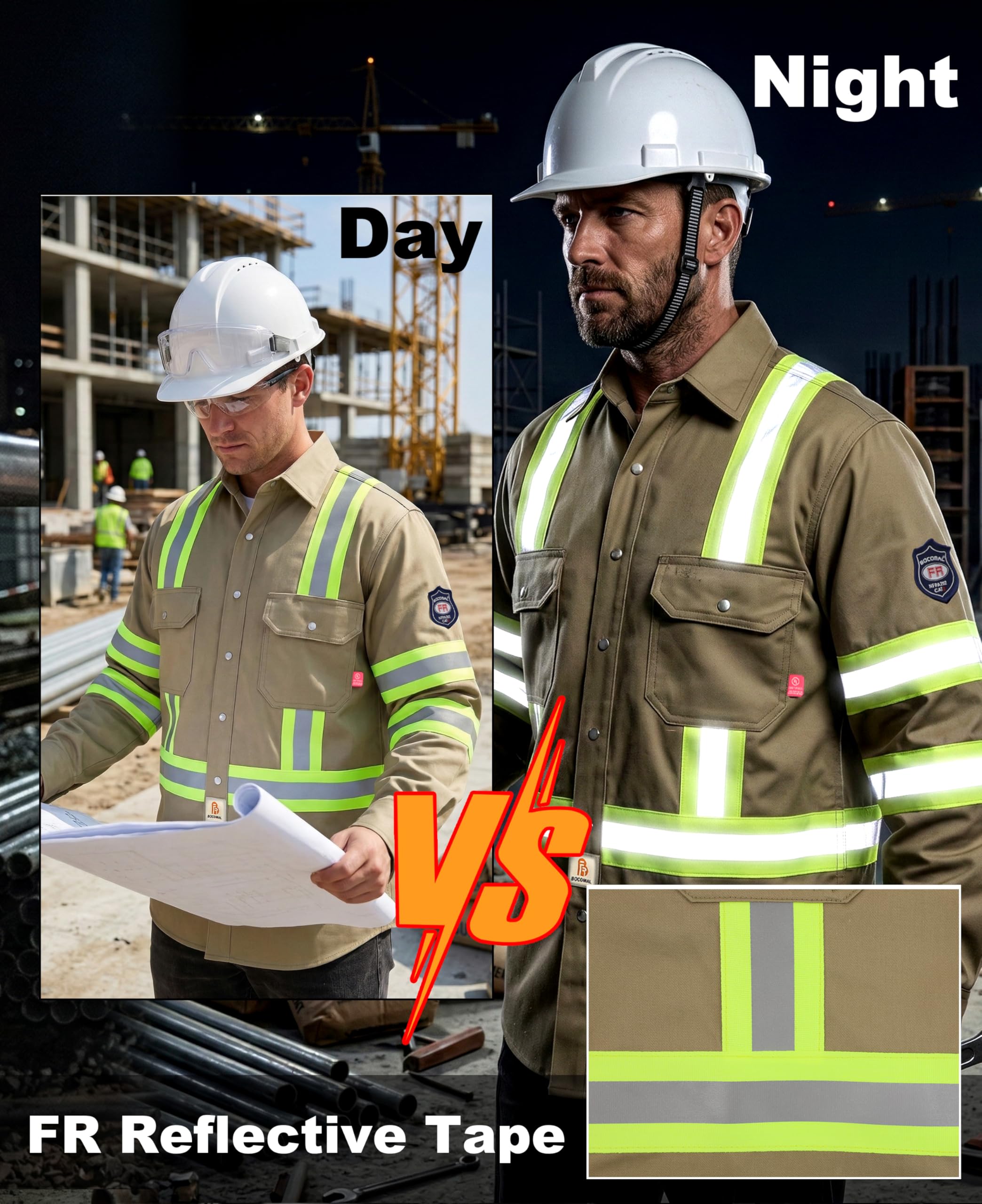 FR MATRIALS:7.5oz cotton twill FR treated,FR buttons,FR aramid sewing threads, 2.4" yellow reflective tape with 1" FR siliver paint-ANSI/ISEA 107-20 Type O CLASS 1.!More area reflection on back and arm.Clear FR tag on arms and more FR info on inside tag about UL certification.We attached a small sample inside package for customers simple FR try