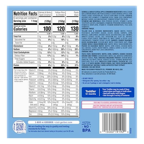 TODDLER FOOD VARIETY PACK: Gerber All Day Favorites variety 6 pack comes with breakfast, lunch and dinner options for your little one. Including a toddler breakfast bowl with apple cinnamon oatmeal cereal, toddler lunch with yellow rice, chicken and vegetables, & pasta stars with chicken and vegetables for dinner