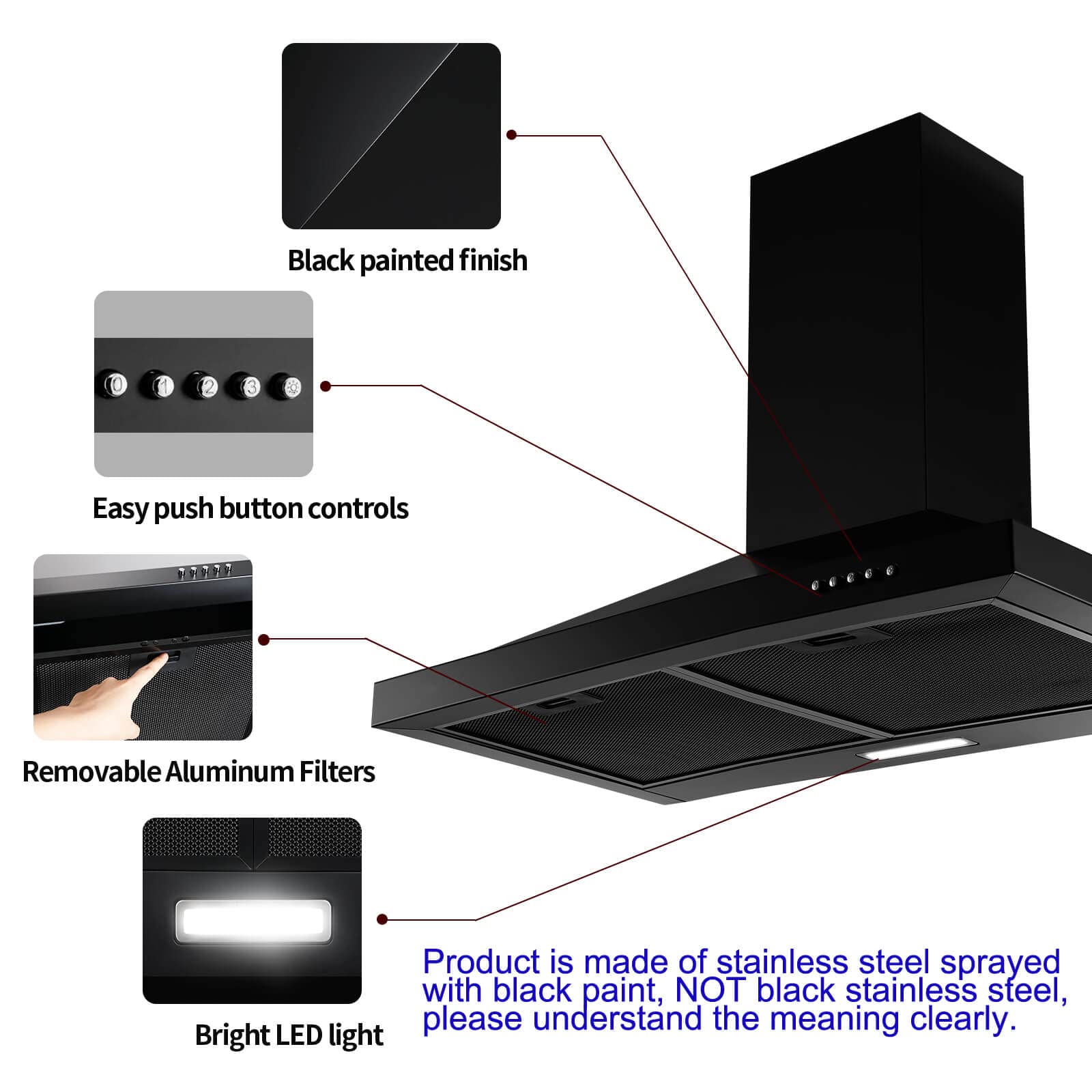 【STAINLESS STEEL RANGE HOOD BLACK GD1760BPA】Made of Premium 430 grade stainless steel, black painted finish body + black aluminum grease filters, high end kitchen hood. 5-layers filters are removable, pretty easy to clean up. Please note that the material of range hood is stainless steel sprayed with black paint, NOT black stainless steel, please understand the meaning clearly.