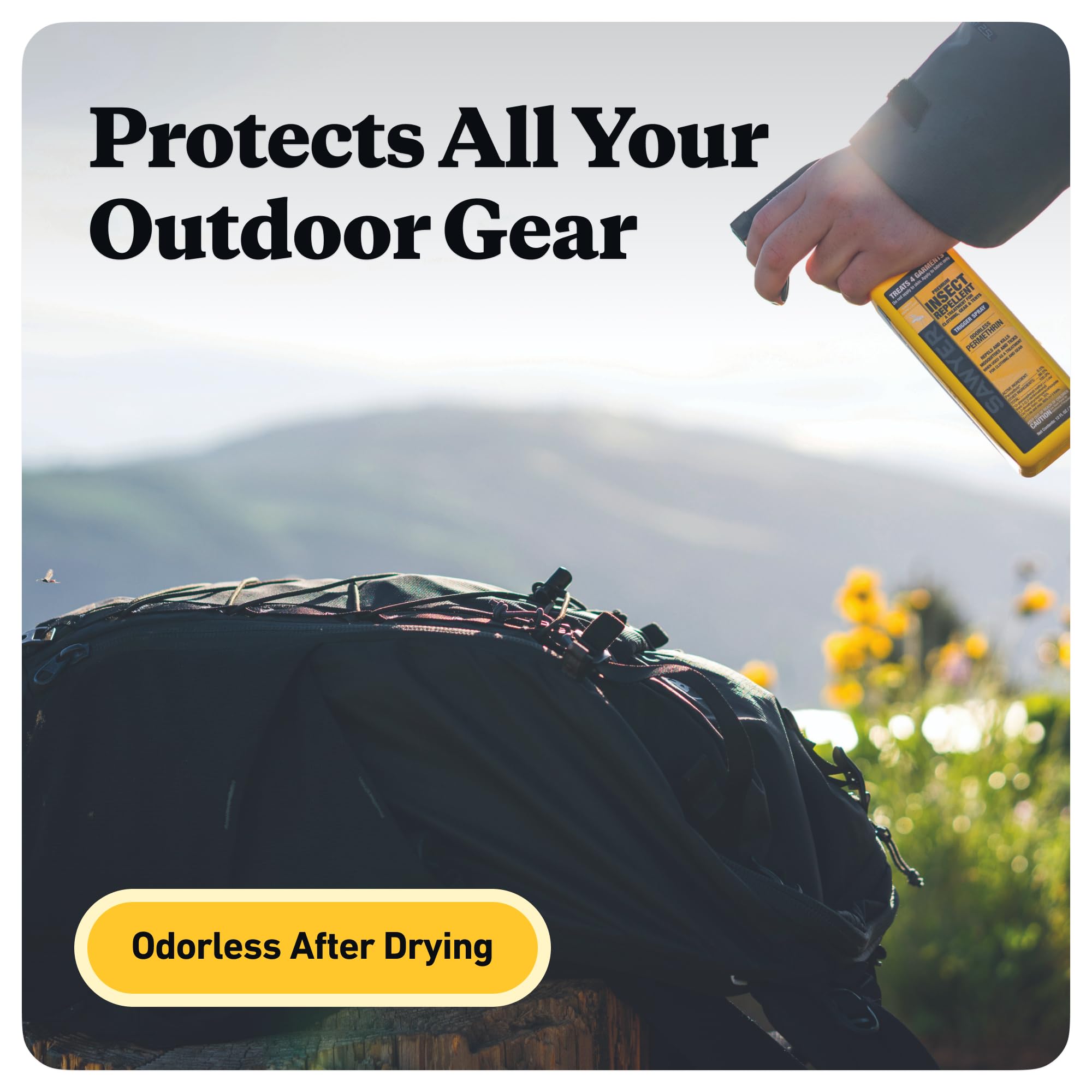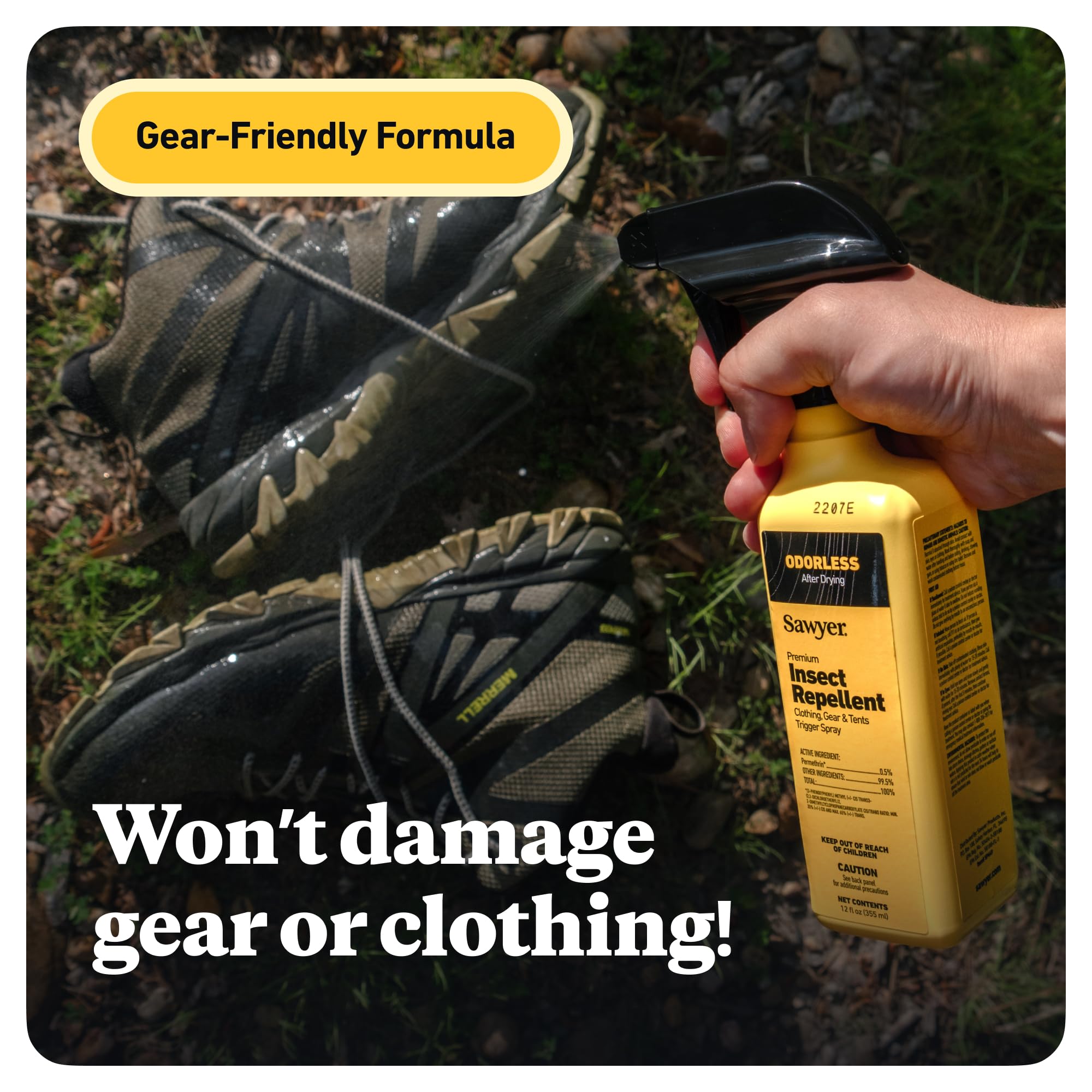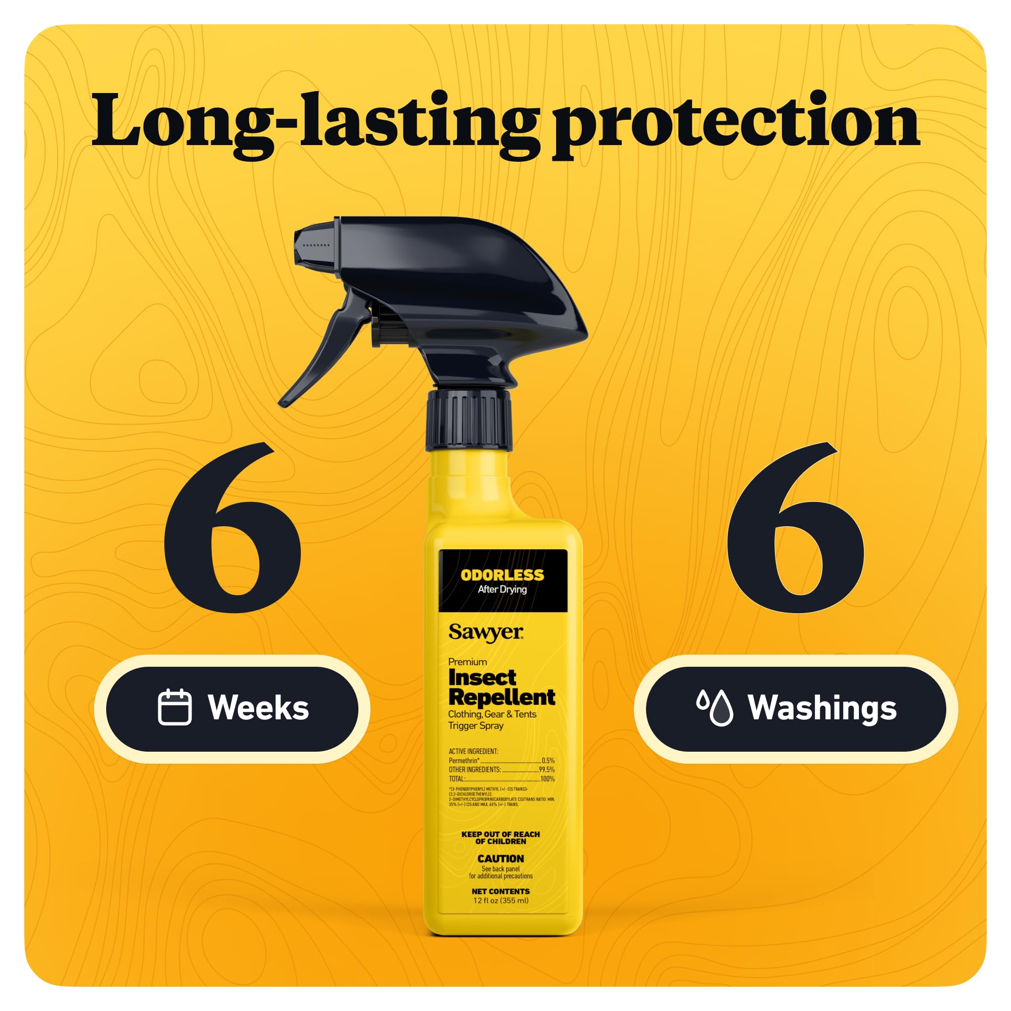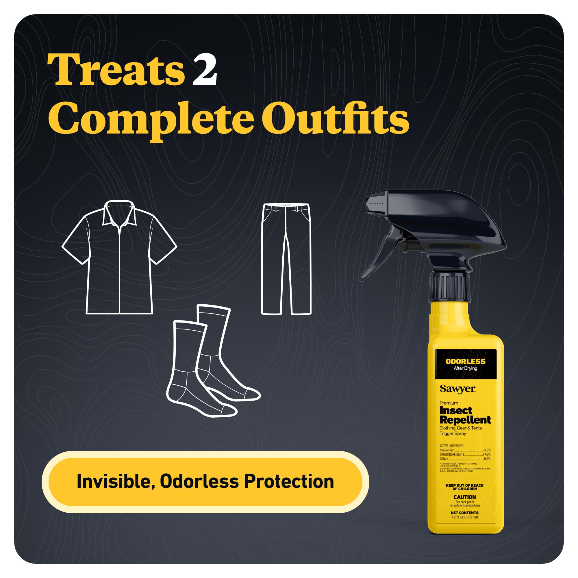 For use on clothing, tents, sleeping bags, and other outdoor gear, Sawyer Permethrin repels or kills disease-spreading ticks (Lyme disease), mosquitoes (West Nile and Zika viruses) and more than 55 other kinds of insects. Perfect for camping, backpacking, hunting, travel, backyard BBQs, picnics, and more. Permethrin insect and tick repellent adds an odorless layer of protection to shirts, jackets, pants, socks, shoes, sleeping bags, tents, netting, and other outdoor, camping, hunting, and travel gear. A University of Rhode Island study (2017) found that people wearing Permethrin-treated shoes and socks were 73.6 times less likely to have a tick bite than those wearing untreated footwear. Using it on outdoor gear also helps reduce the mosquito population in your camp and prevents ticks from attaching to you. Permethrin spray bonds to fabric fibers for up to 6 weeks (42 days) of exposure to sun or 6 washings. Sawyer Permethrin does not come out from sweat or water contact. It only degrades via UV exposure or the agitation of a washing machine. Specially formulated not to stain or damage your clothing, other fabrics, gear, and equipment, it's odorless after drying and is as effective as 100% DEET. To apply, spray Permethrin directly onto clothing and gear with a slow sweeping motion, keeping the bottle about 6 to 8 inches away, and treating each side of the garment for about 30 seconds. The EPA recommends using 4.5 ounces of Permethrin to spray each outfit (consisting of shirt, pants, and socks). Maximize protection by pairing with Sawyer Picaridin topical repellent for the skin. Sawyer Products has offered the best, most technologically advanced solutions for protection against sun, bugs, water, and injuries – everything from first aid kits developed for wilderness to point-of-use water filters that filter contaminated water to levels cleaner than U. S. bottled water.