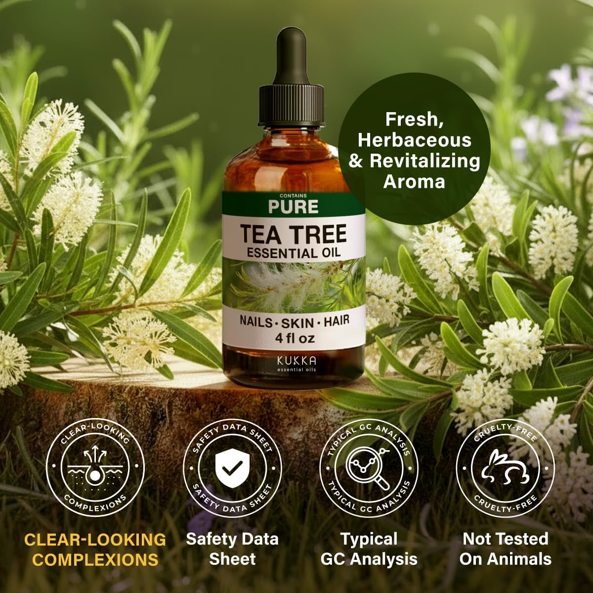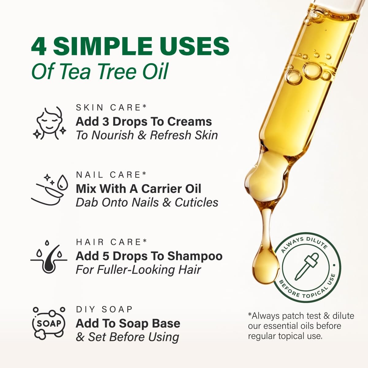 Potent and sourced from Australian forests, our Tea tree oil for scalp undergoes rigorous testing for quality & efficacy. For topical use, dilute your oil with carrier oil before using on skin or nails. Perform a patch test before use.