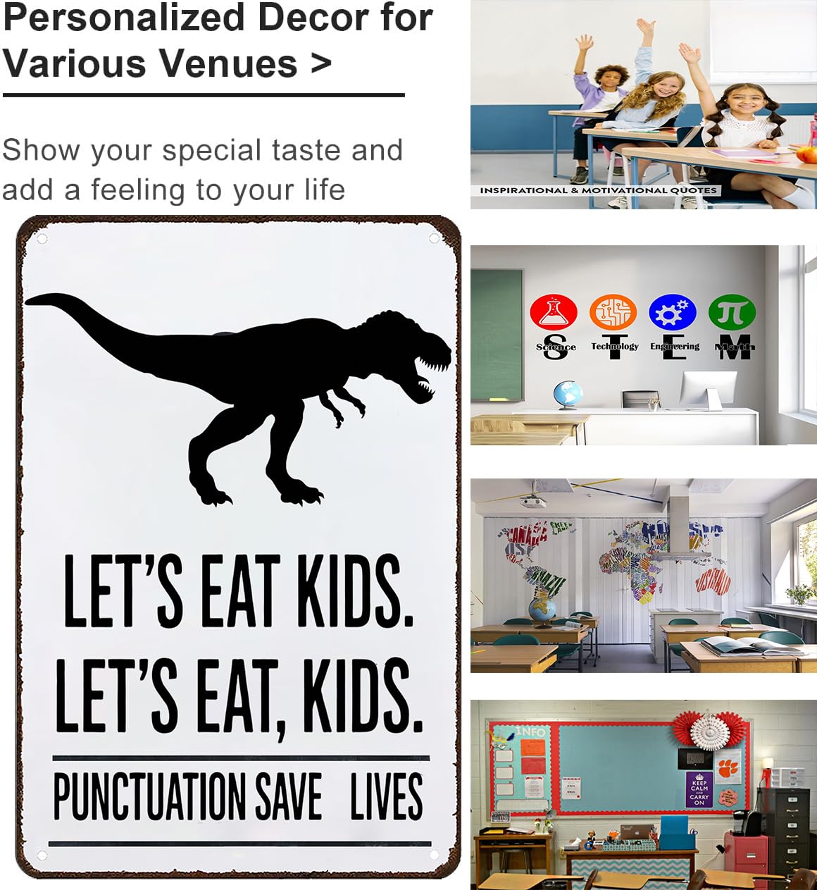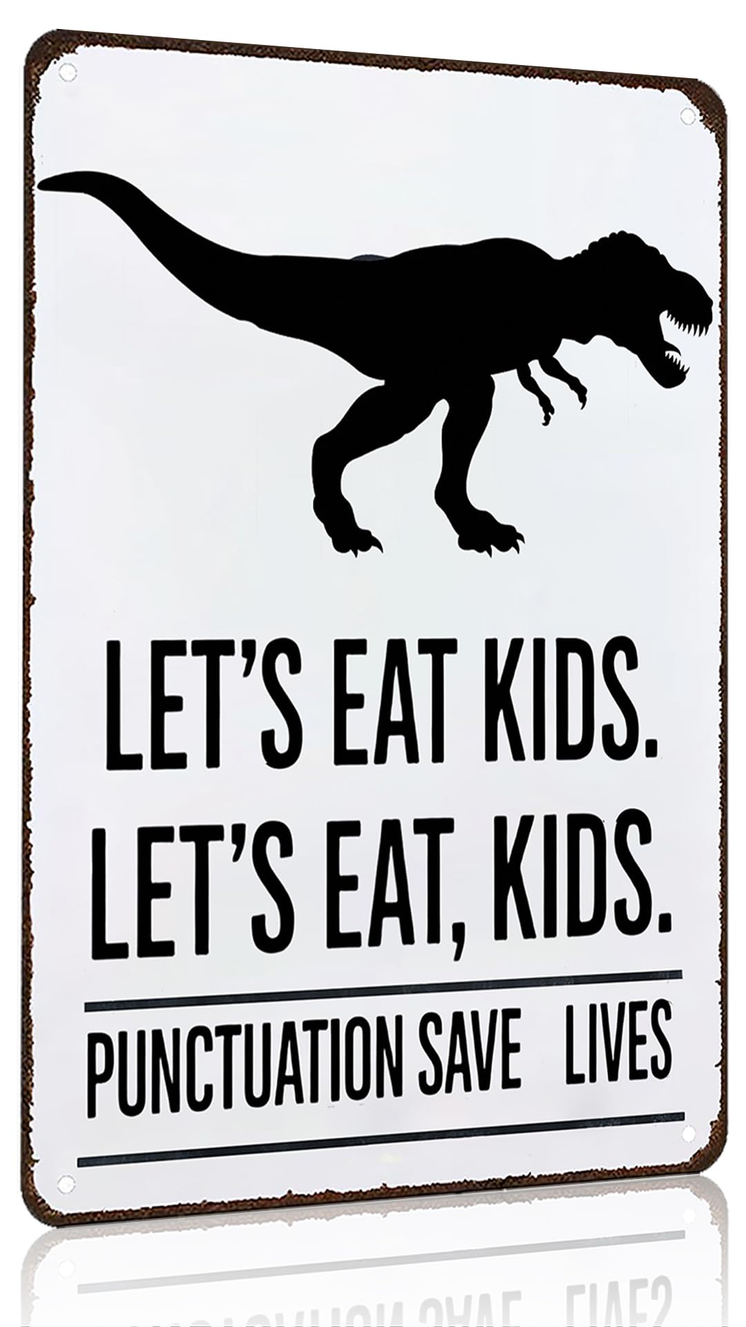 Make Punctuation Fun & Memorable!This vintage-style tin sign turns a critical grammar lesson into a roaringly funny joke. Featuring the iconic phrase âLETâS EAT KIDSâ (without a comma) vs. âLETâS EAT, KIDSâ (with a life-saving comma), itâs a brilliant visual aid for English teachers, homeschool parents, or language lovers. The mischievous T-Rex silhouette adds playful urgency to the message: âPUNCTUATION SAVES LIVESâ!