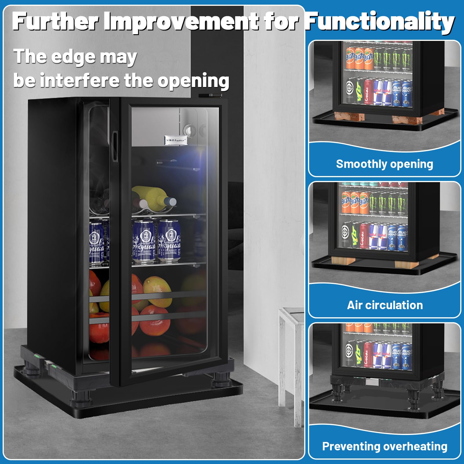 Further Improvement for the Functionality: The height of the refrigerator mat is about 0.8", for some refrigerators, the edges may be a bit high and interfere with the opening and closing of the door. But once you raise the refrigerator by Nefish mini fridge stand to add some height to your fridge, it has the dual function of allowing air circulation and preventing overheating