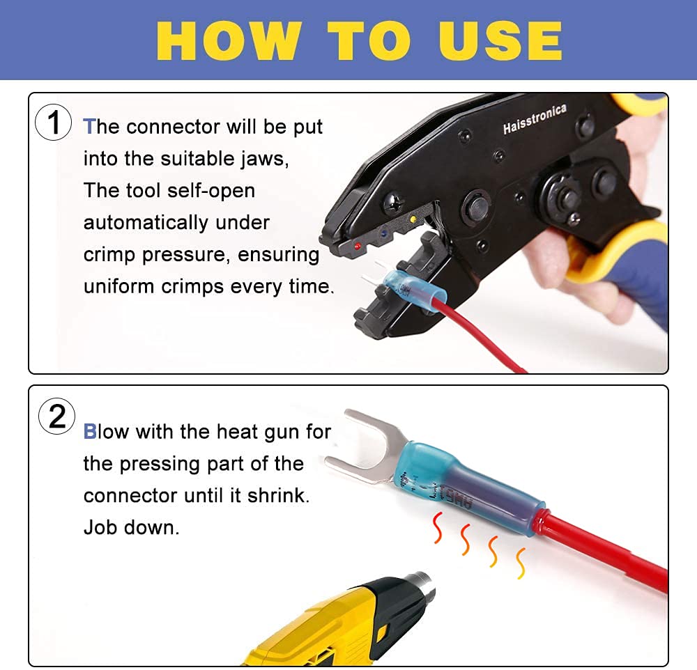 Unyielding Protection:Unlike cheap,low-quality connectors,these high-quality thick 3:1 heat shrink tubing of heat shrink connectors won't puncture and break when crimping.After heating,the end penetrates enough hot melt adhesive to form a firm seal.Helps retain the wire in the connector much better than just a standard crimp style