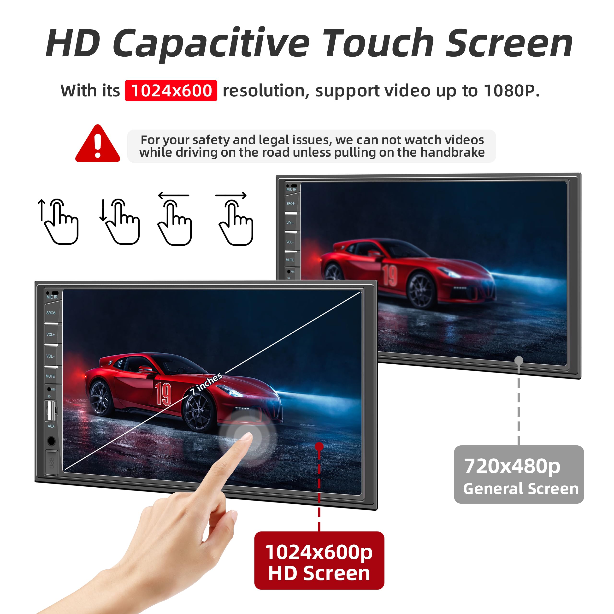 【Capacitive Touchscreen & Mirror Link】7 inch touchscreen car aduio receivers equipped with high definition capacitive touch screen, supporting 1920*1080P video, enhance your visual experience. You can put the mobile phone apps on the HD display via the mirror link that you could realize control between your phone and car stereo. Easily reachable physical buttons, USB, TF and AUX port to offer multiple options for music and movie enjoyment in the vehicle.