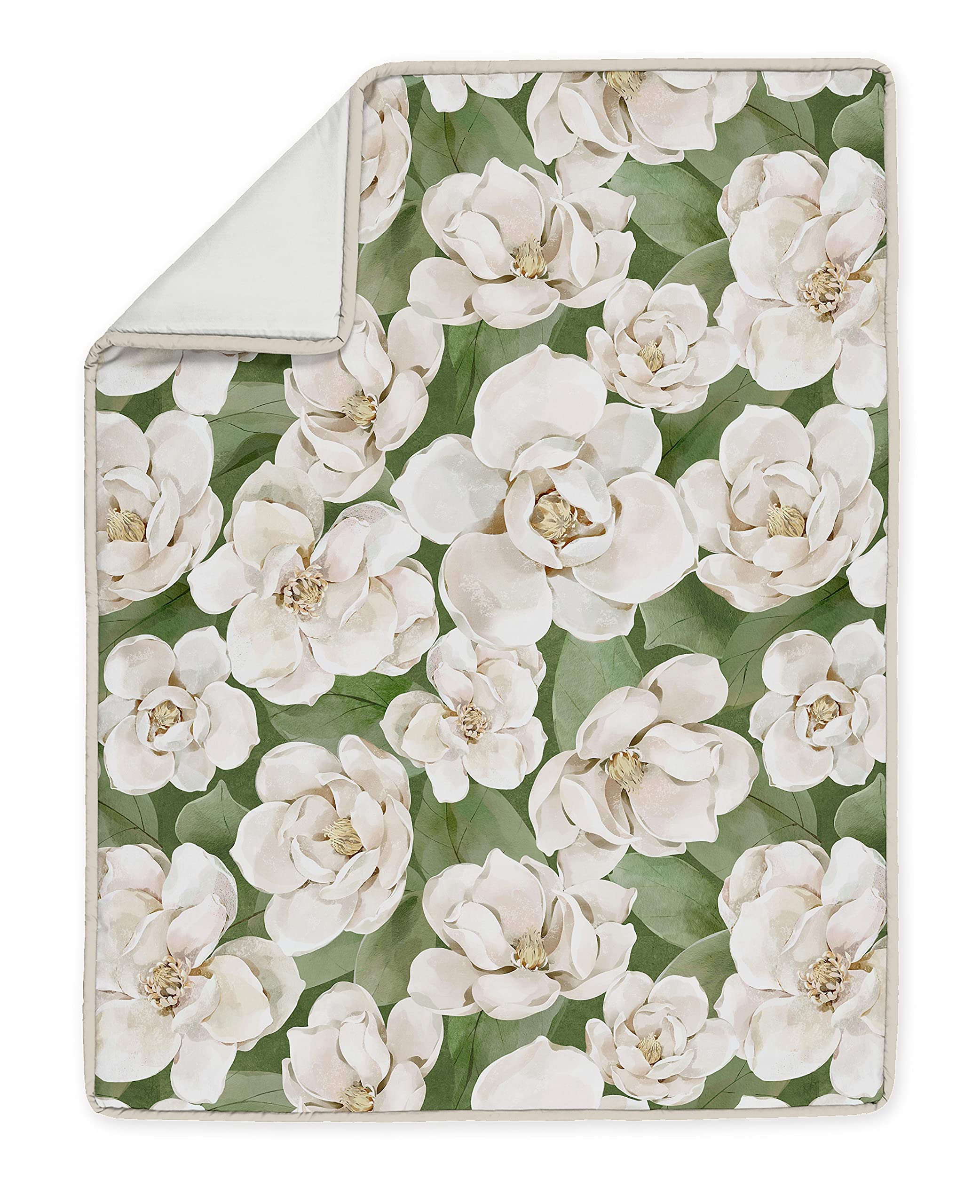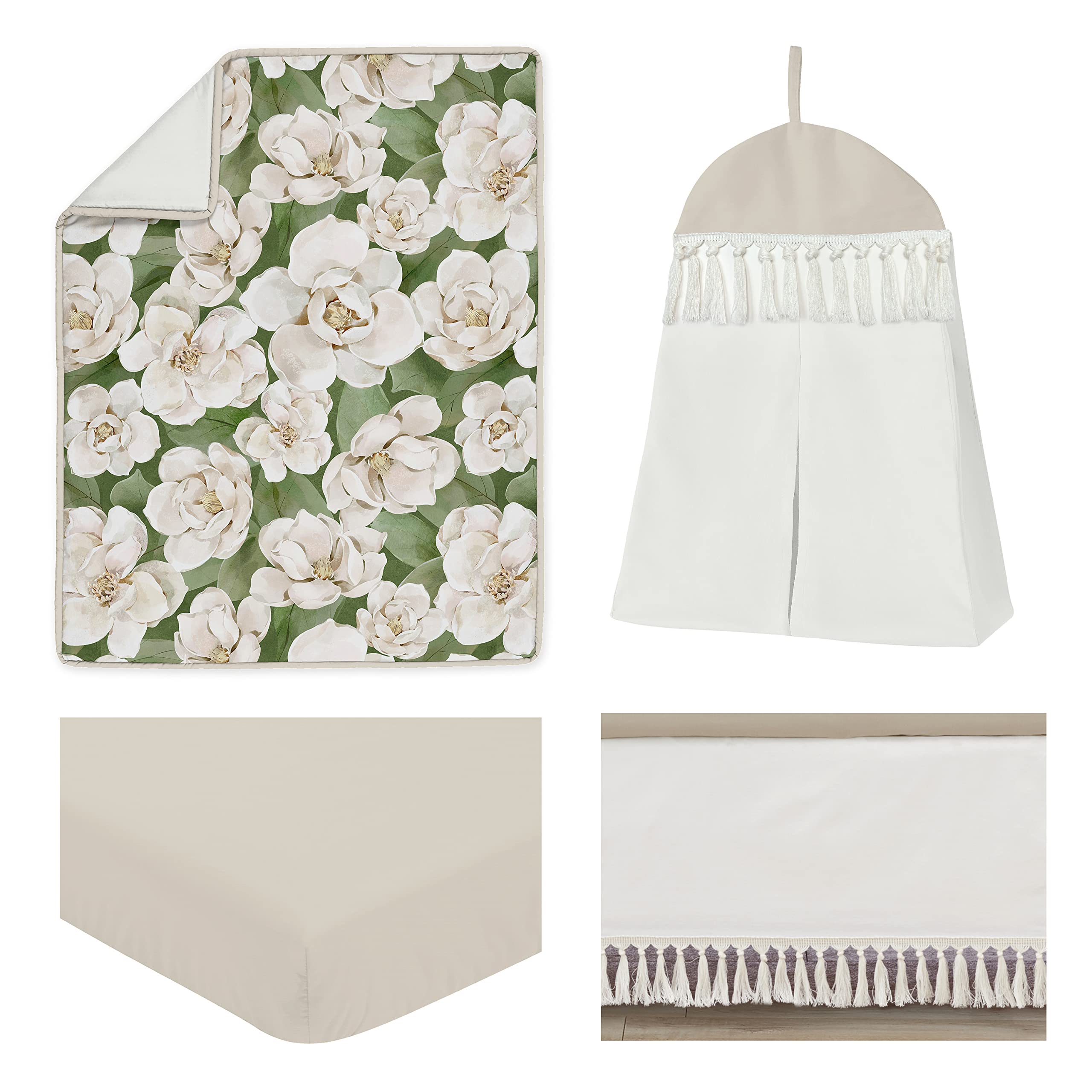 This set boasts a hand painted bohemian watercolor magnolia flower print and solid fabrics with macrame fringe accents