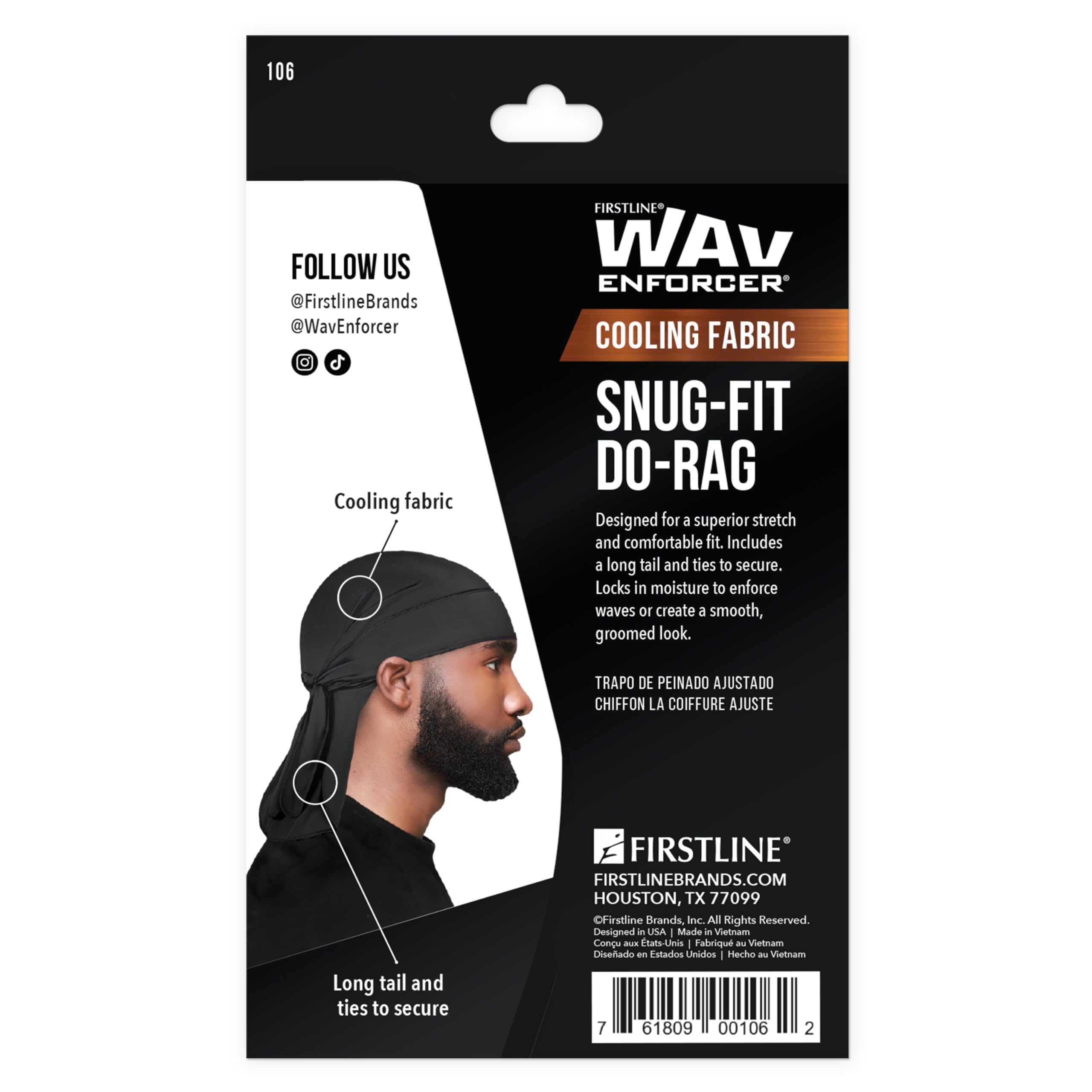 WavEnforcer spin snug-fit do-rag has a superior stretch material that keeps head cool and dry. Locks in moisture for overnight maintenance and healthy hair growth or retention. Features include superior stretch material for a comfortable fit. Long tail and ties allow for a secure fit. Great for use with waves, fades and low-cut styles. Keeps styles laid and intact overnight.