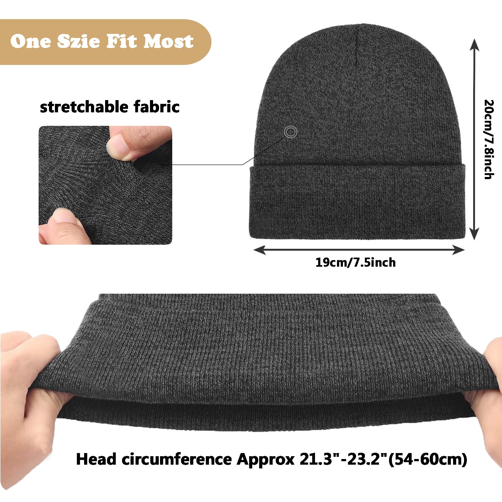 One Size Fits Most: The cuffed knit beanie is made of high stretch acrylic, suitable for most adult men, women and teens, boys, girls. Head circumference: Approx 21.3"-23.2"(54-60cm) that will fit most people head size. Knit Items have stretch so the dimensions can vary