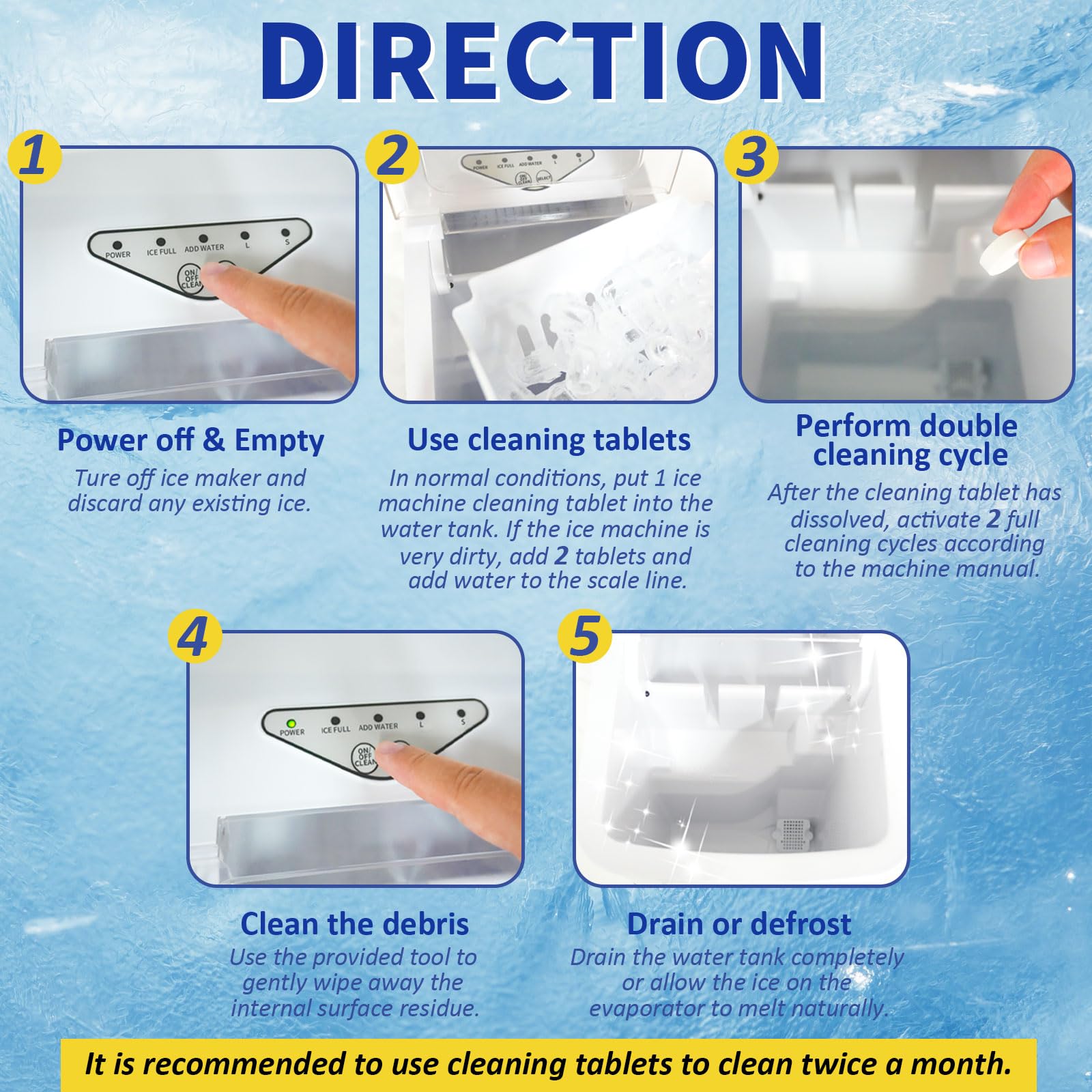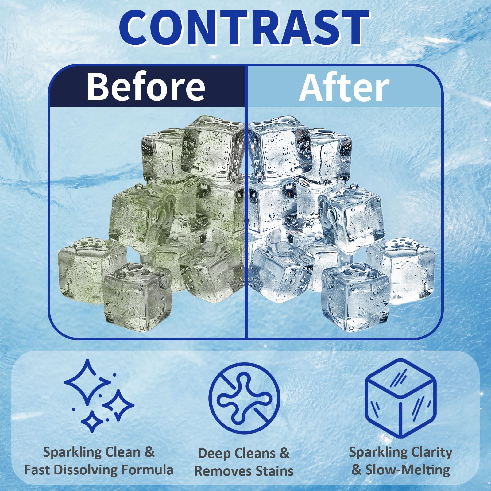 【Better-Tasting Ice】Designed for Countertop, Portable, and Commercial ice maker cleaner needs, our tablets ensure pure, clear ice with no off-flavors—perfect for drinks, commercial use, or home kitchens.