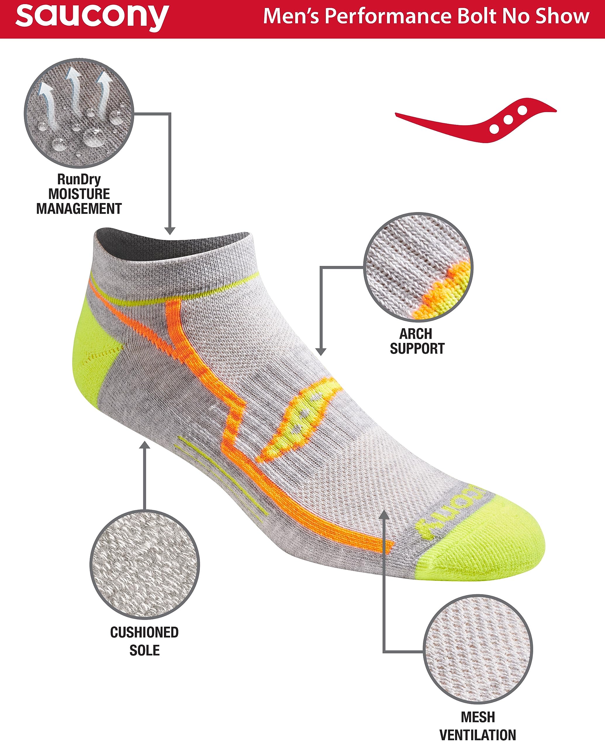 Description Saucony men's performance no show socks is a perfect combination of comfort and support. Great for the toughest training sessions. Its arch support, air mesh venting, and moisture management features will ensure lasting comfort Run for Good - Saucony was founded way back in 1898. Ever since, we have been loyal to the sport, building goodness into every product and inviting millions around the world to run with us. At Saucony, we exist for runners, Runners inspire us, bringing us new idea, force us to be better, they drive our design and engineering. They keep us competitive. They keep us hungry. They keep us honest. This focus and passion fuels us as we strive to create the best running shoes and apparel on the planet. We leave work each day knowing we’ve done everything to make runners live just a little better.