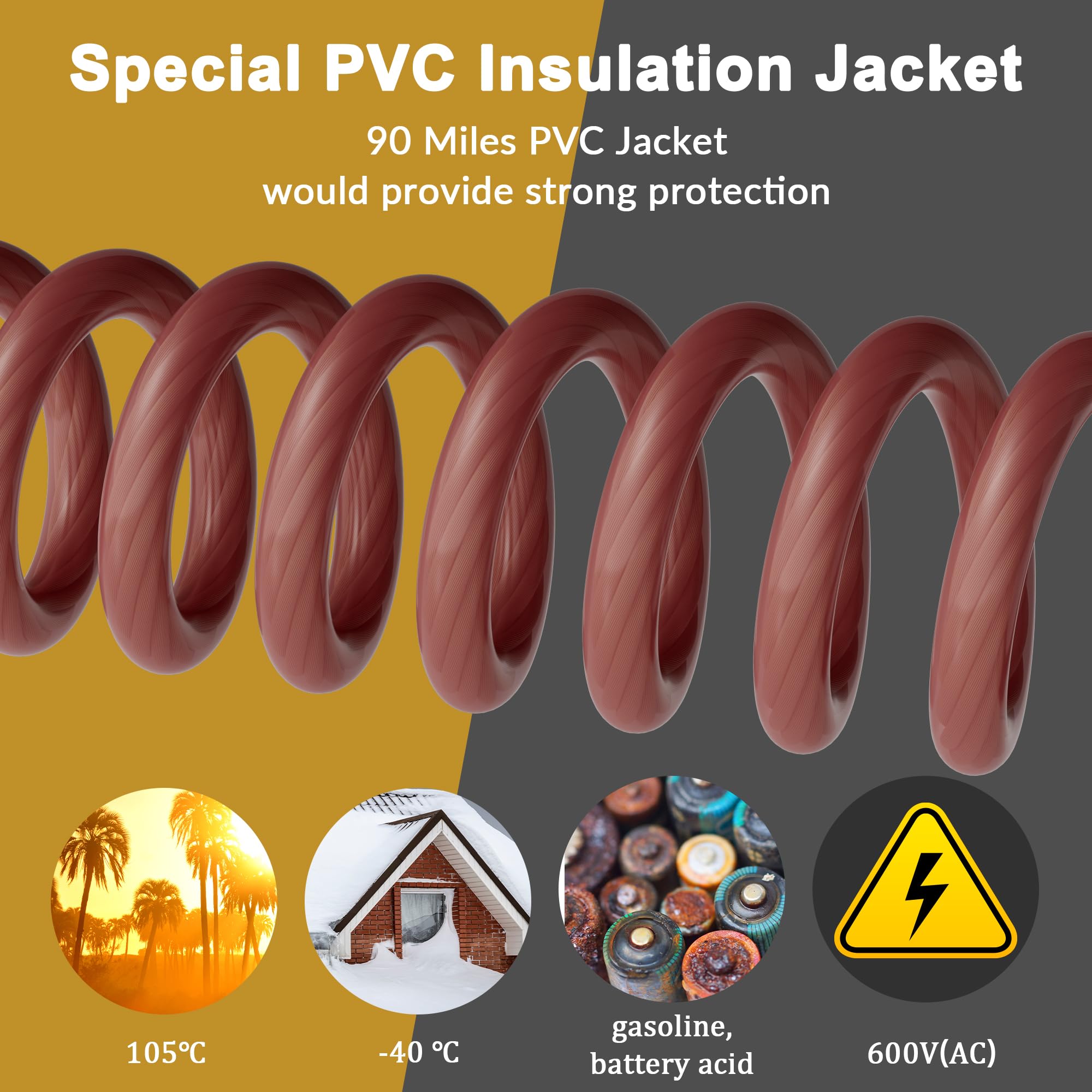Soft-Touch PVC Jacket Maximizing Flexibility and Durability- HiFind true spec 4 gauge wires come with a rugged 90 Miles PVC jacket, offering both flexibility and durability for challenging placements, effectively preventing cable oxidation, corrosion, high temperature, gasoline, battery acid and abrasion. Its soft-touch design suits electrical and auto repair installations, providing indoor use versatility with built-in resilience to impacts and diverse conditions. Extreme Heat Tested.
