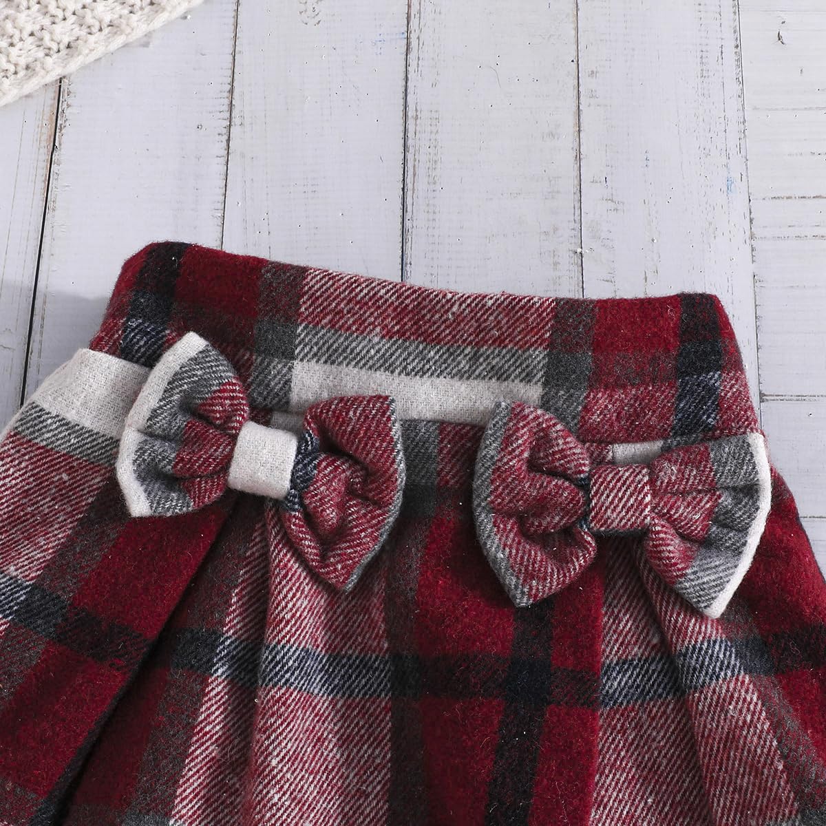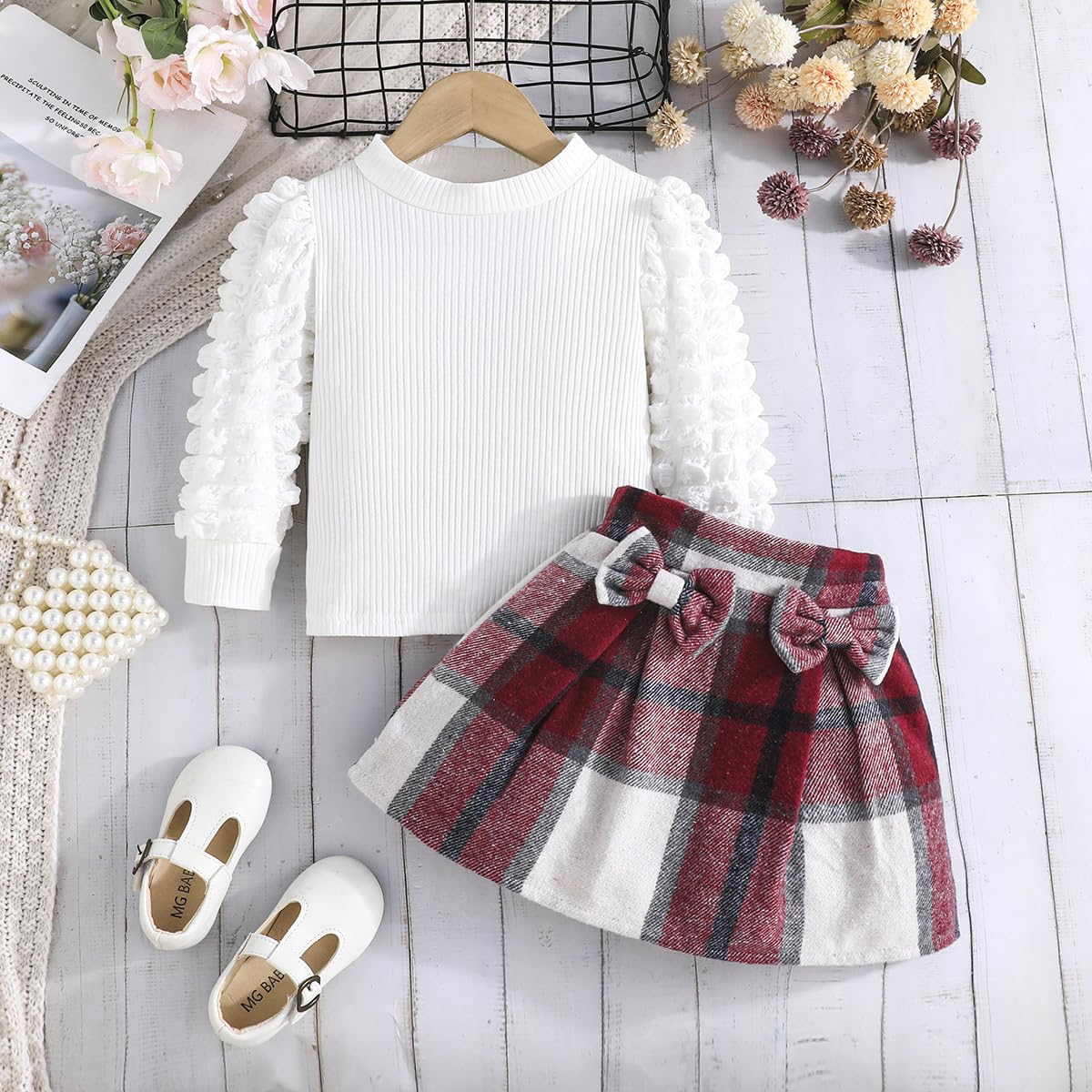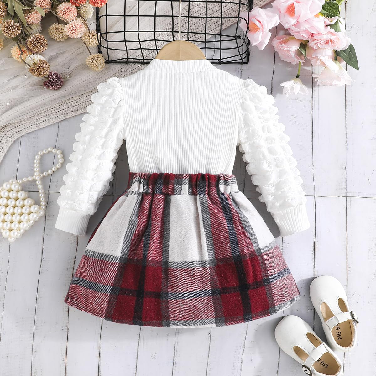 Feature: Christmas outfits for girls,cute lantern puff sleeve,classic red plaid Skirt,comfy ribbed shirt and tweed plaid skirt set, girls plaid skirt with delicate bowknot decoration,lovely and stylish, Suitable for your little princess in autumn winter and Christmas wear.